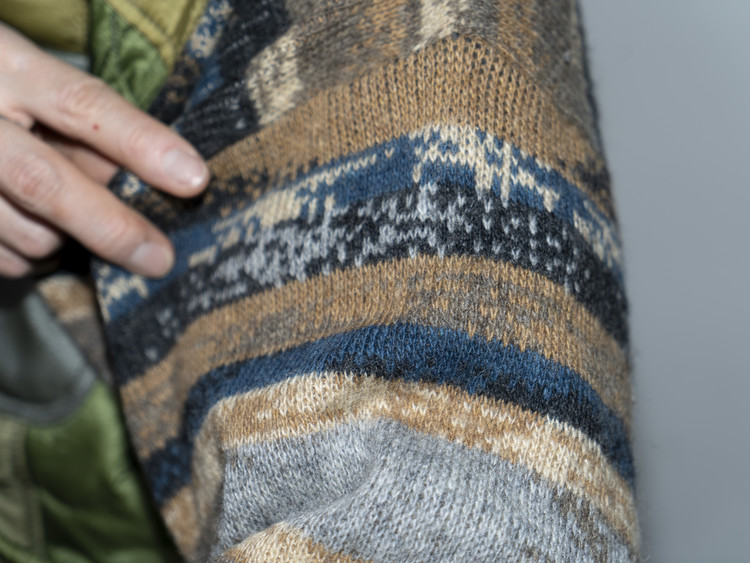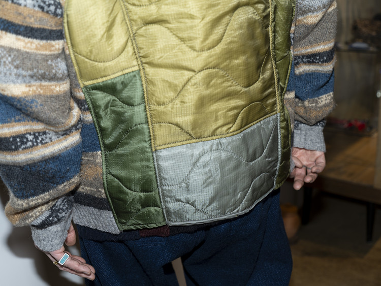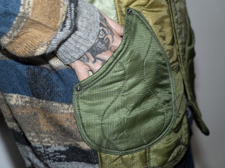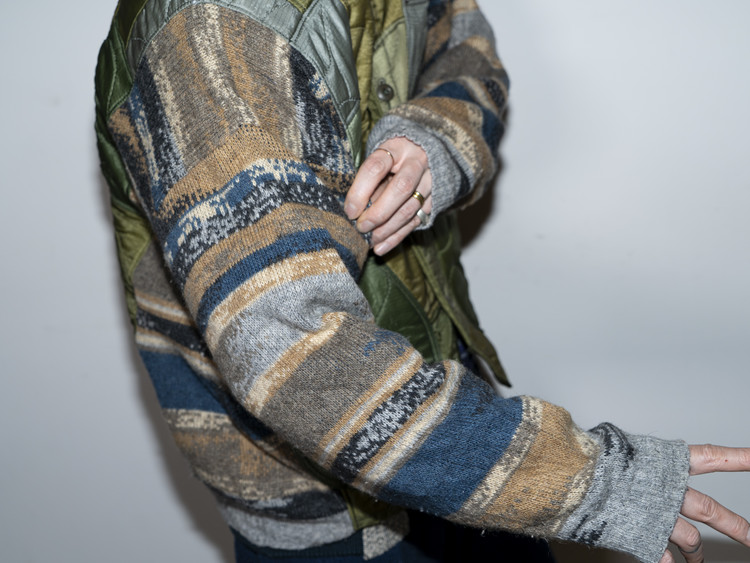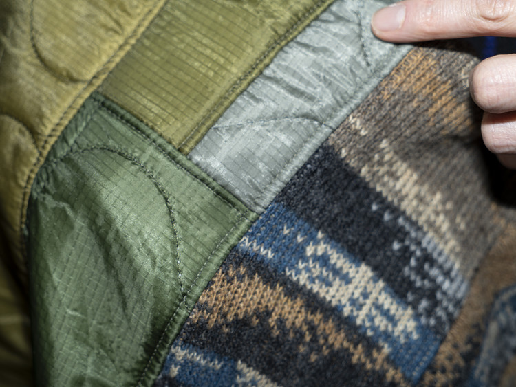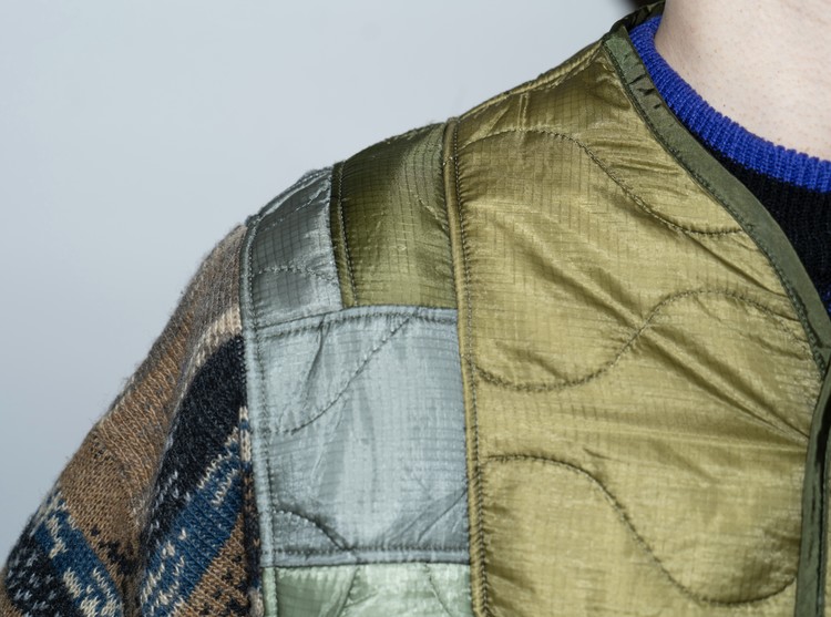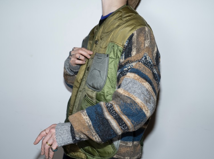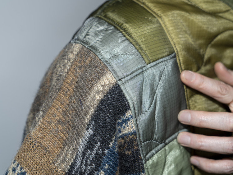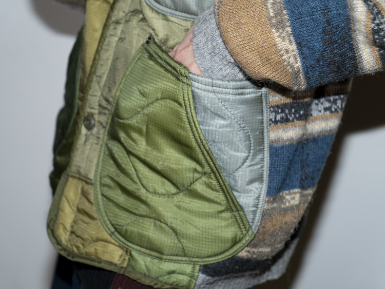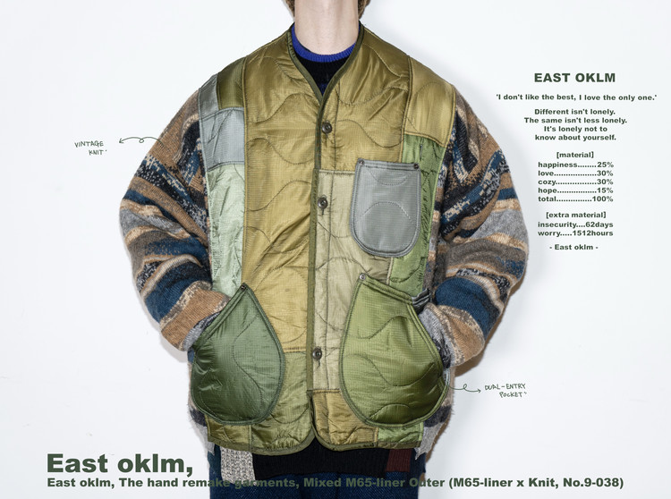 East oklm, The hand remake garments 라인의 겨울 아우터로, 여러 장의 M65 라이너와 니트를 해체하고 재구성하여 완성한 리메이크 제품.