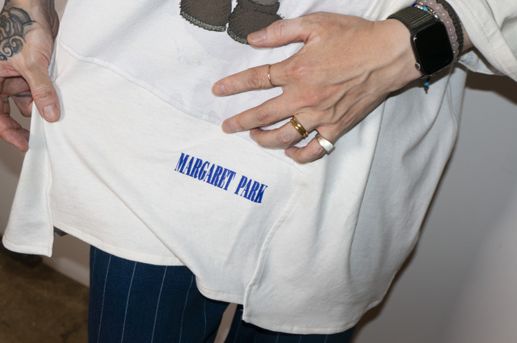 화이트 색상의 티셔츠들로 믹스해주고, 뒤판의 길이감을 앞판보다 길게 만들어 좋은 균형감을 가지며, 끝단의 길이감에 차이를 두어 리메이크의 기분을 더 느낄 수 있습니다.