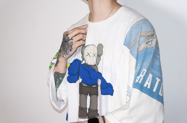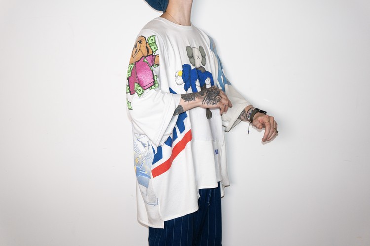 East oklm, The hand remake garments로 KAWS Companion 티셔츠와 여러장의 빈티지 티셔츠들을 해체하고 재구성하여 만들어진 믹스 티셔츠 상품.