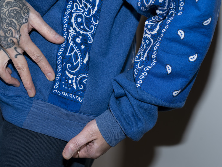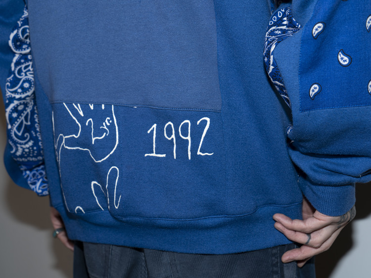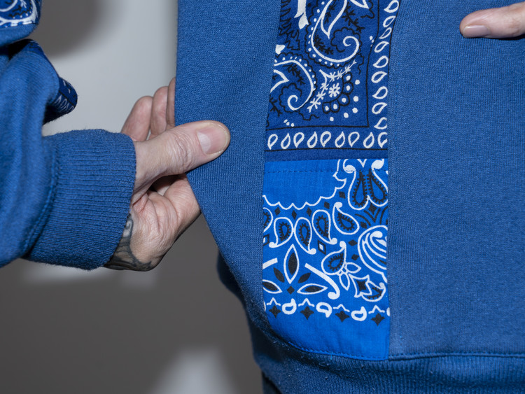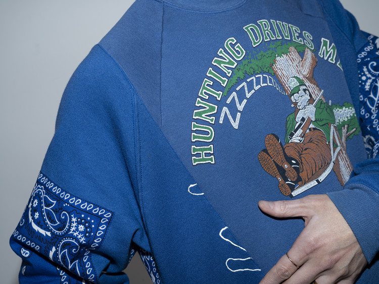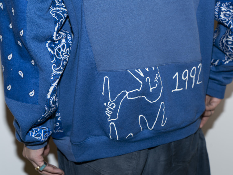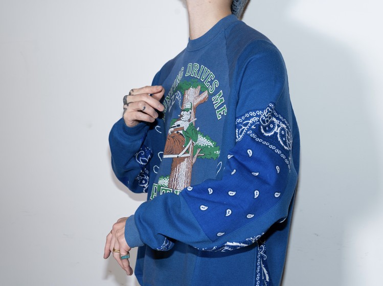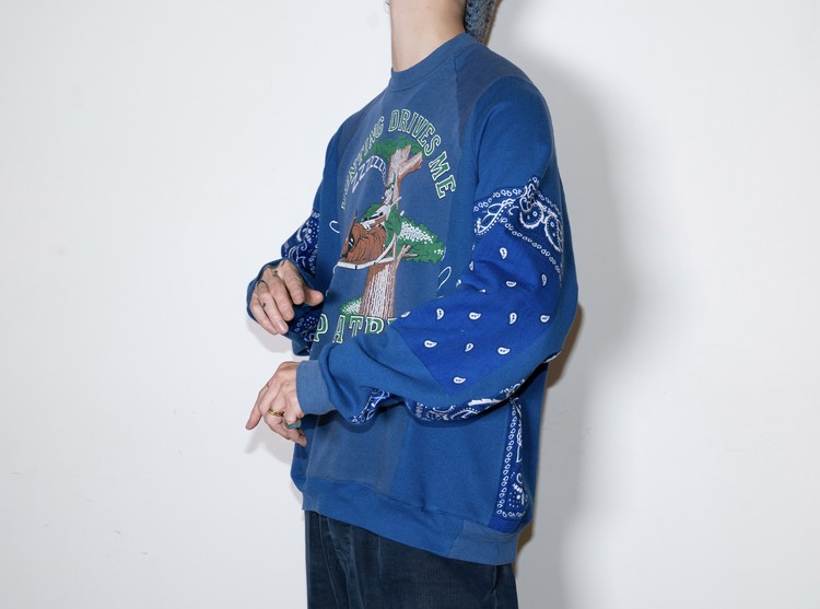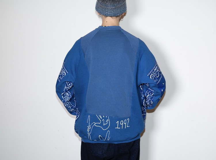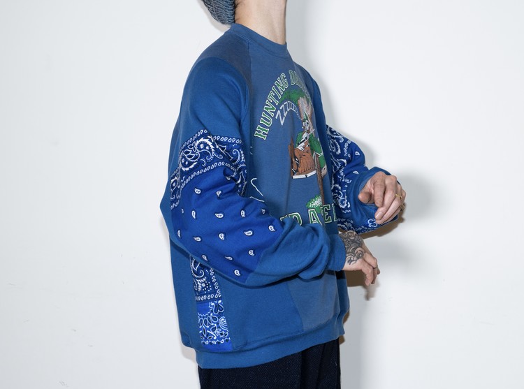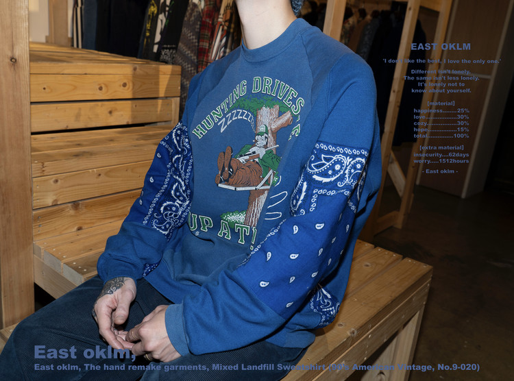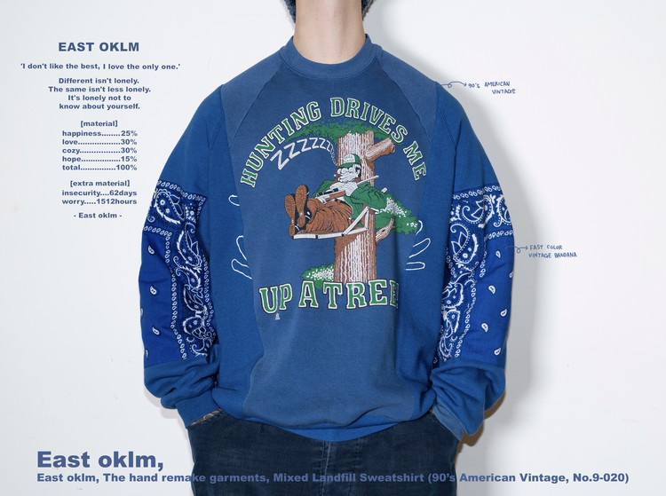 East oklm, The hand remake garments 라인으로 90’s American Vintage 스웻셔츠들을 해체·재구성하여, 빈티지 반다나로 포인트를 더한 리메이크 스웻셔츠 상품.