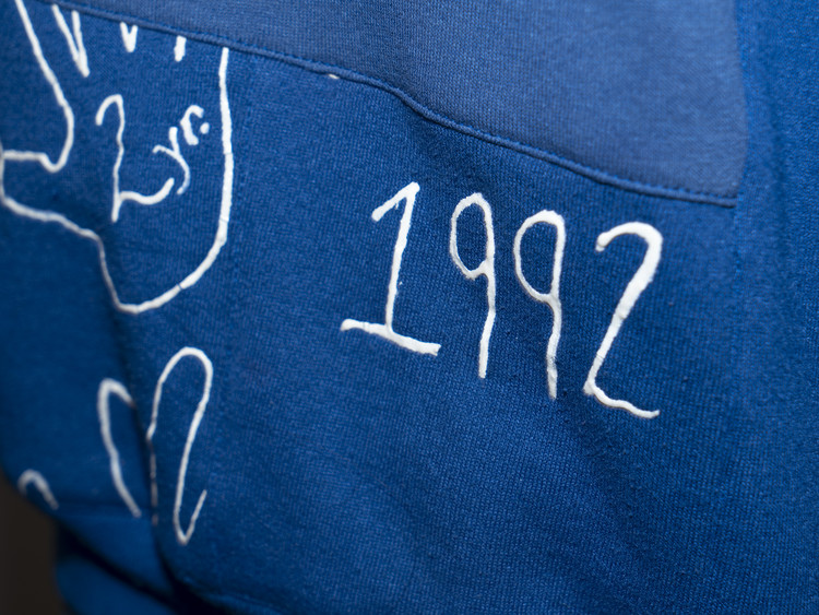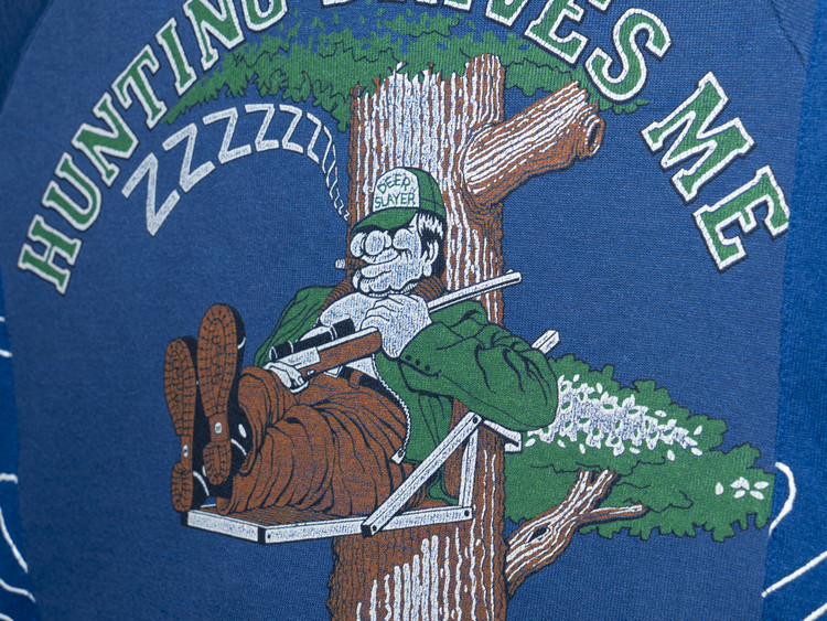 같은 블루 계열이지만 서로 다른 세월감과 톤을 가진 스웻셔츠들을 믹스해 독특한 색감의 조화를 완성했으며, 빈티지 프린팅과 조각들의 구조적인 연결이 인상적입니다.