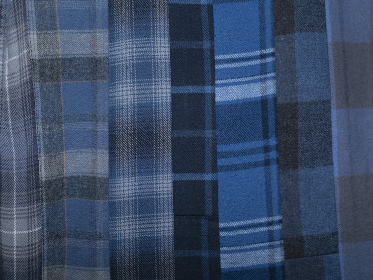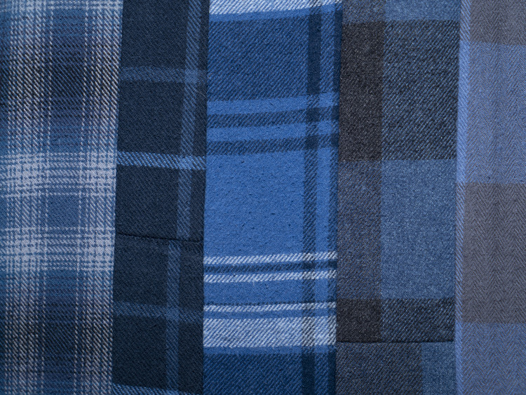 특히 빈티지 특유의 체크 패턴과 세월감이 담긴 블루 계열 색상의 조각들을 주로 사용해, 자연스러운 톤 차이와 흐름이 세로 라인을 따라 나타나도록 구성했습니다.