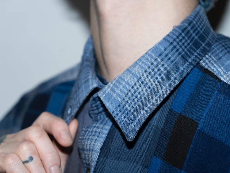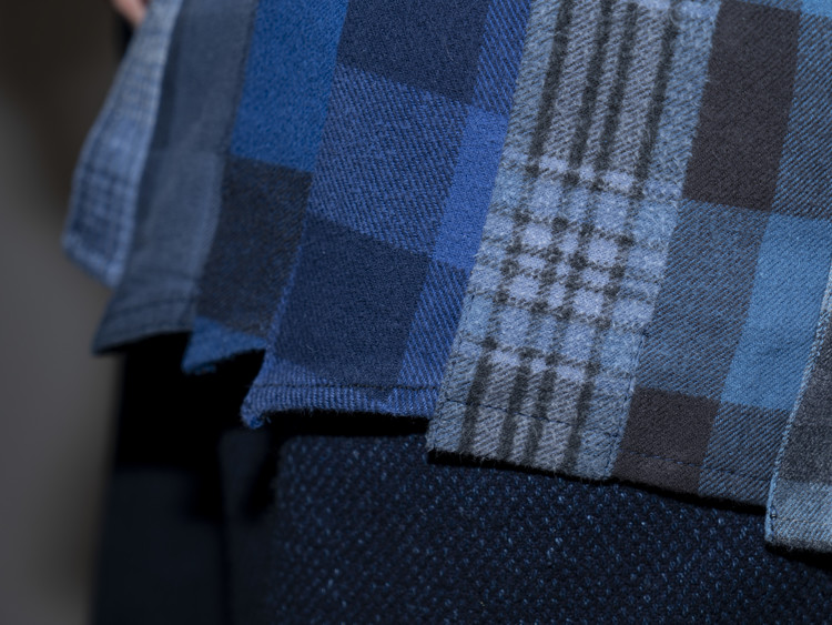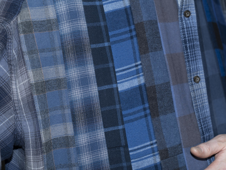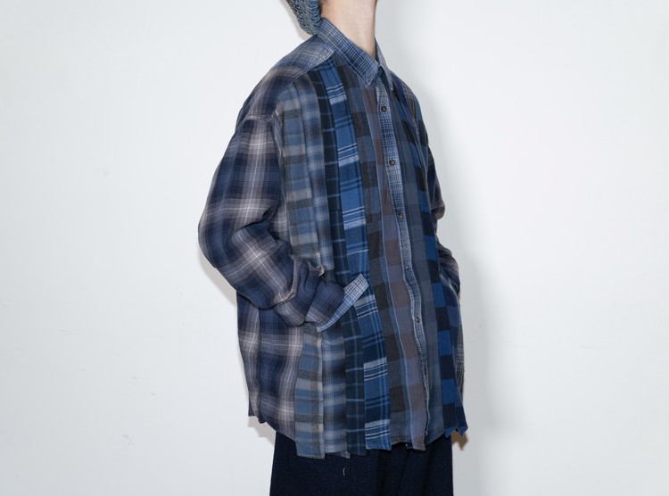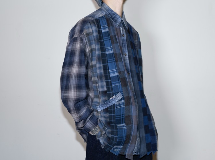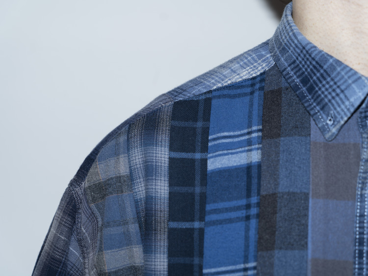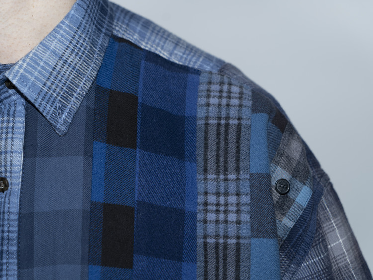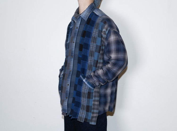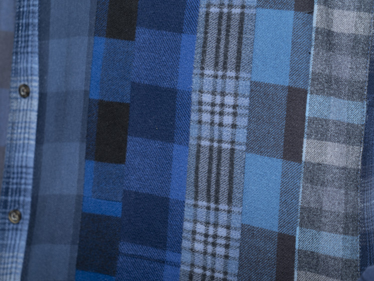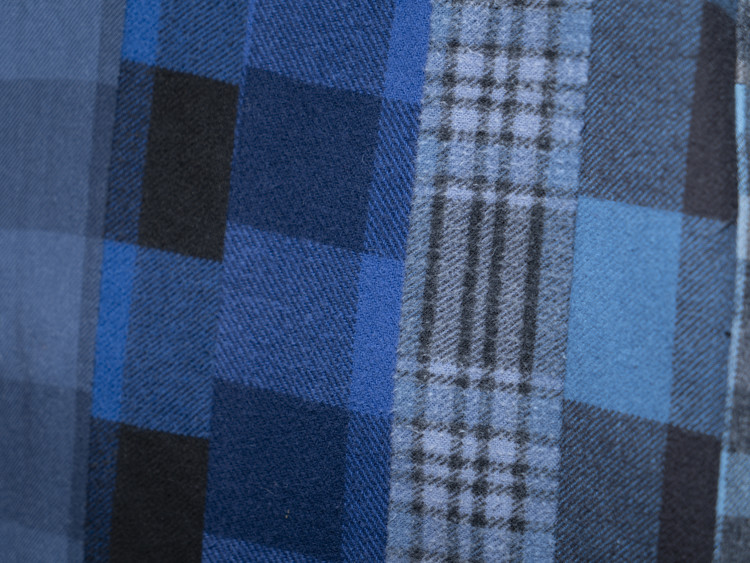 중심이 되는 두 장의 플란넬 셔츠를 해체해 재구성하고, 다양한 빈티지 플란넬 셔츠를 해체하여 조각낸 원단들을 빈티지 블루 톤을 중심으로 세로 패널 형태로 이어 붙여 앞판 전체에 독특한 패치워크 구조를 완성했습니다.
