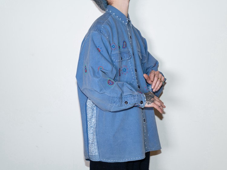 옆 라인을 채운 반다나는 셔츠의 톤에 맞춰 Color-Fade 작업을 진행한 빈티지 반다나로, 두 겹을 사용해 셔츠의 두께감과 자연스럽게 어우러지도록 제작되었습니다.