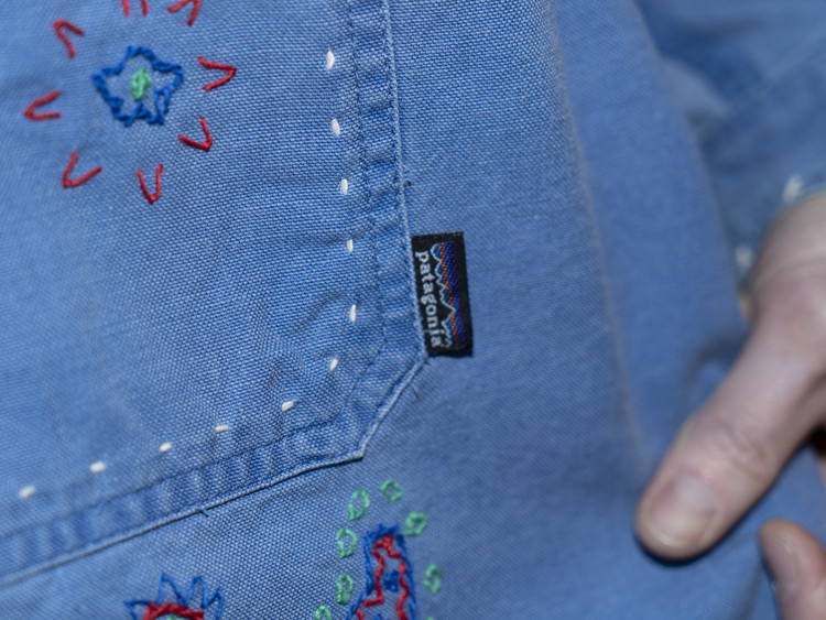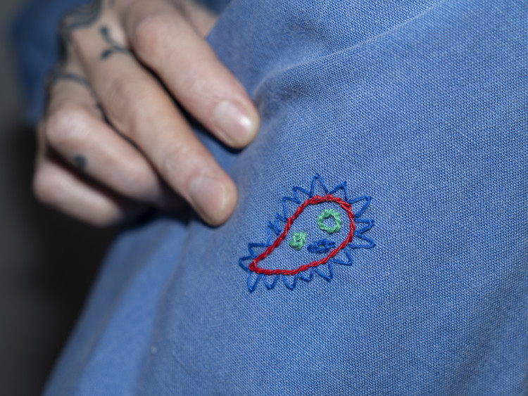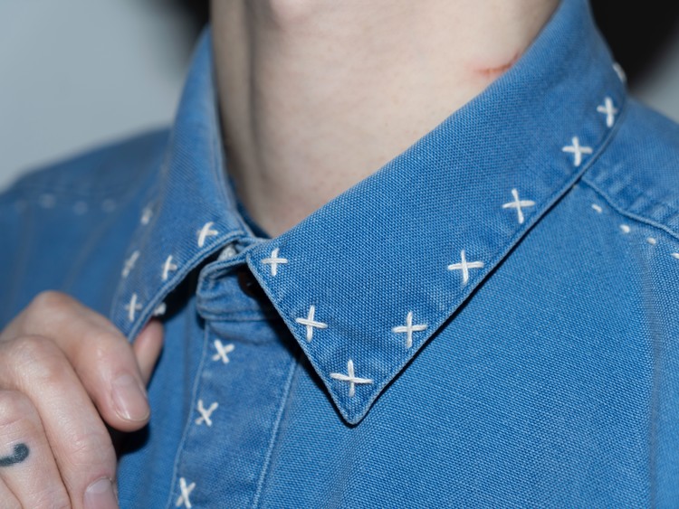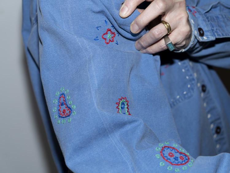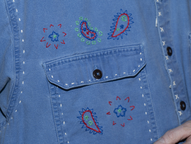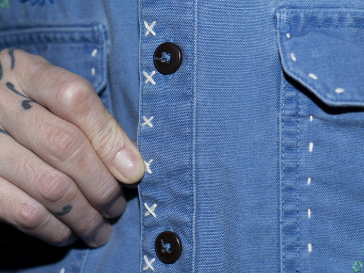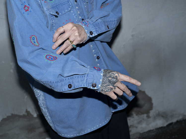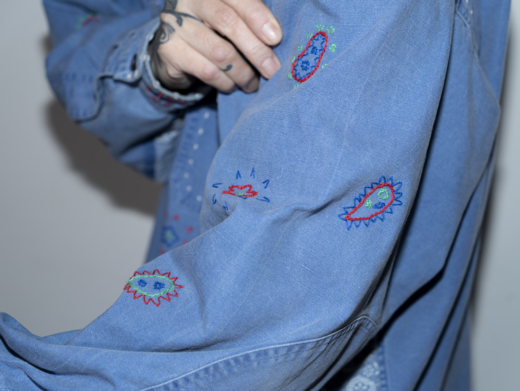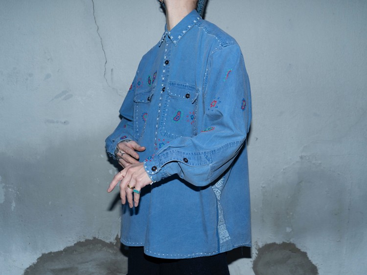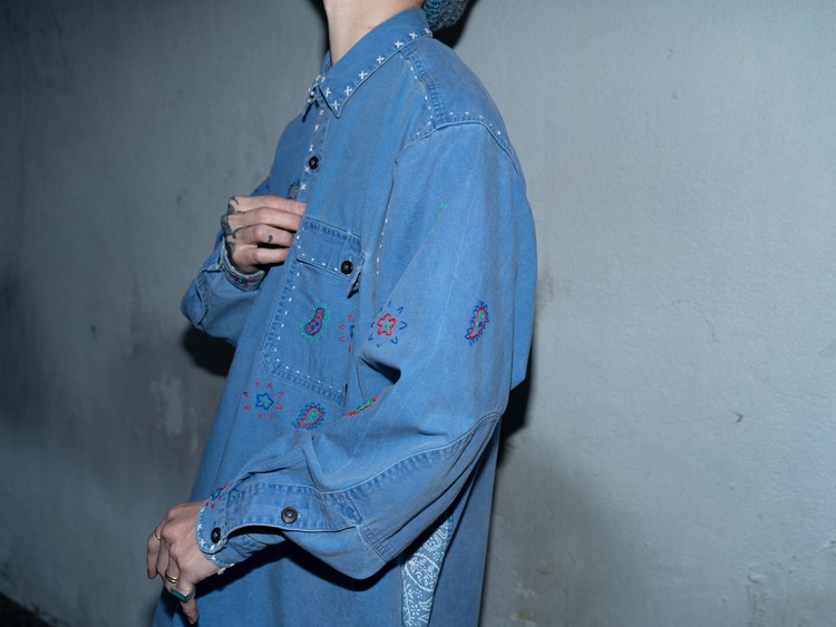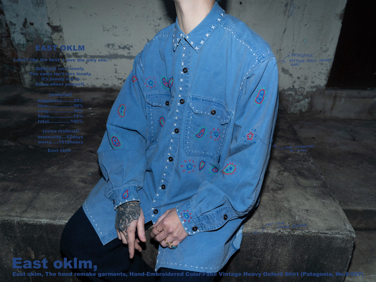 East oklm, The hand remake garments로 적절한 세월감이 닿아 부드럽게 바랜 빈티지 블루 톤의 Heavy Oxford 셔츠에 Landfill 작업과 한 땀 한 땀 더해진 핸드 자수가 어우러져 완성된 제품.