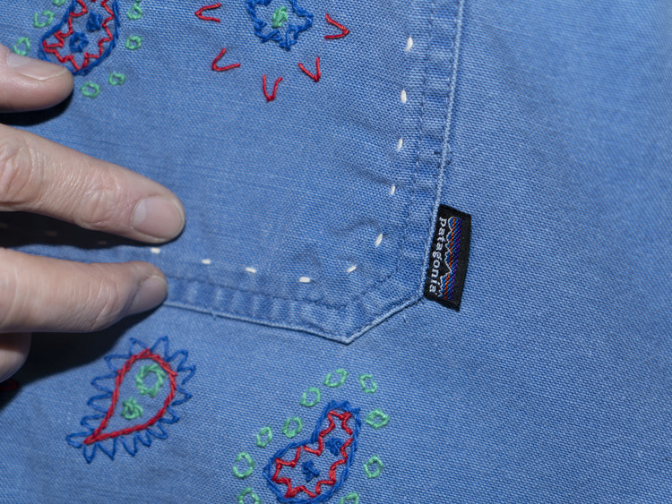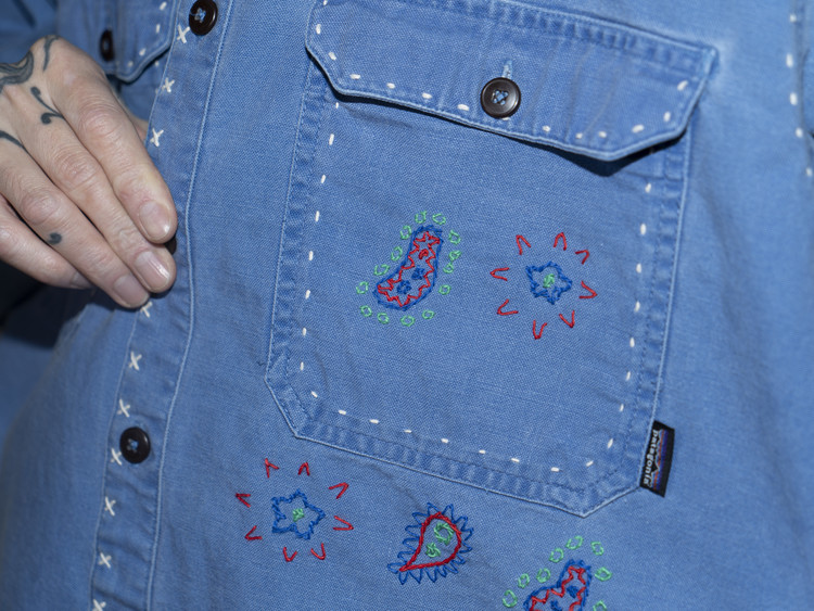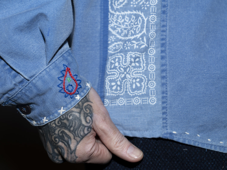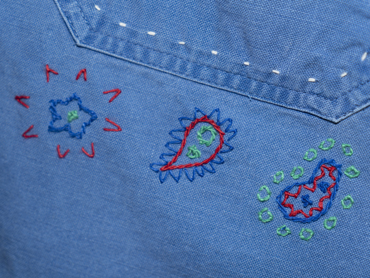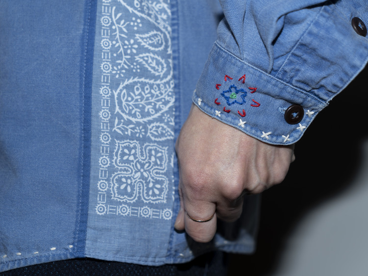 두께감 있는 실을 사용해 끝단과 봉제 라인이 닿는 부분, 소매 커프스 등에 핸드 스티치를 더했으며, 레드·블루·그린 컬러를 활용해 빈티지 반다나에서 볼 수 있는 문양들을 앞판, 포켓, 소매 등 다양한 위치에 표현했습니다.