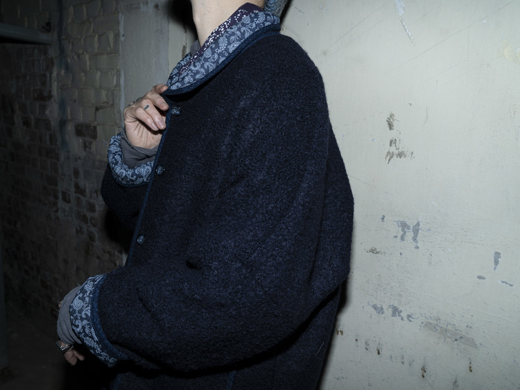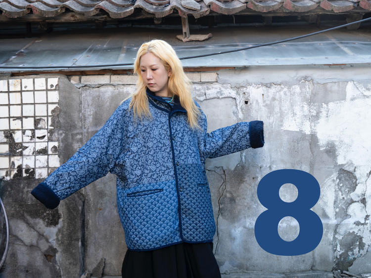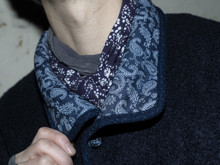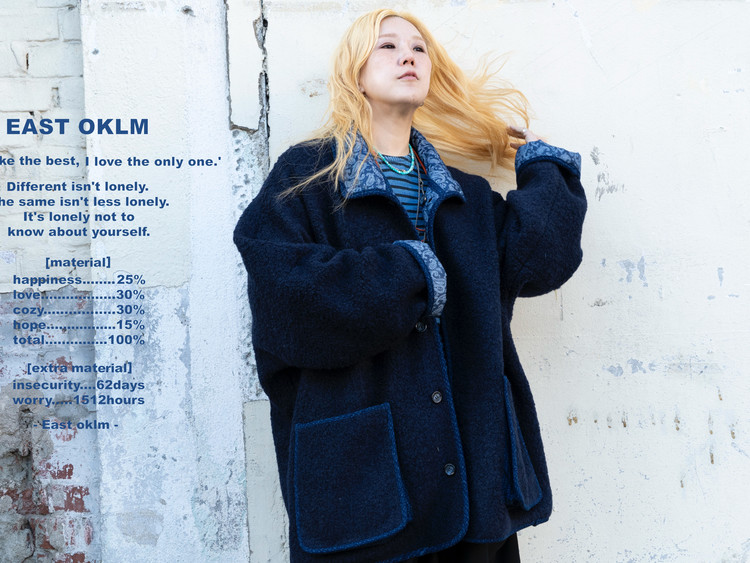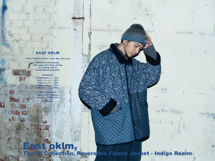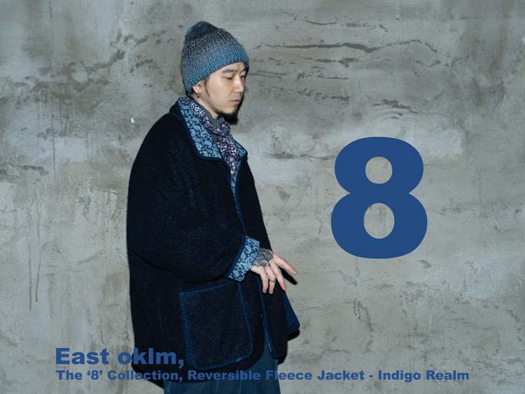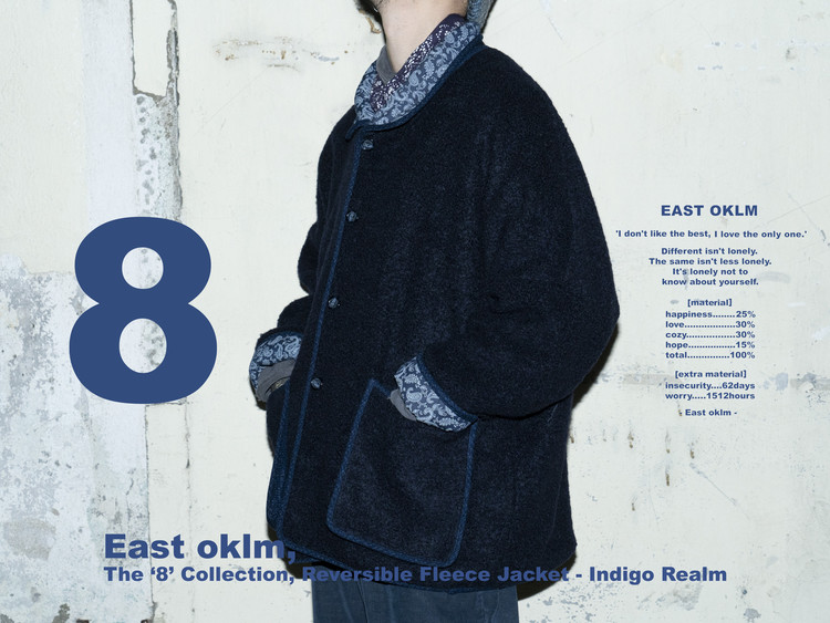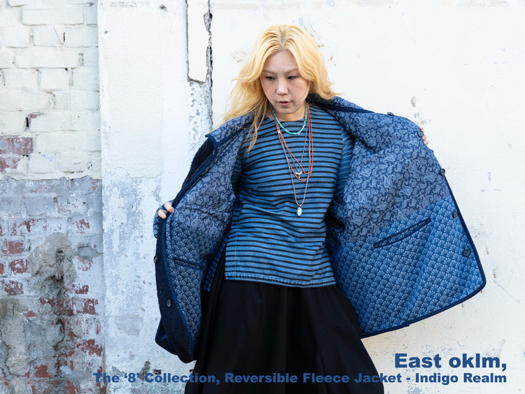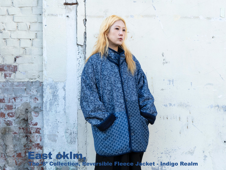 East oklm의 ‘8’ Collection으로, 깊이 있는 Indigo 톤의 울 혼용 겉감과 페이즐리 및 동양적 패턴이 돋보이는 데님 안감을 조합해 양면 착용이 가능한 리버서블 플리스 자켓 상품.