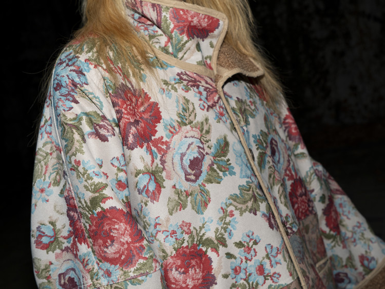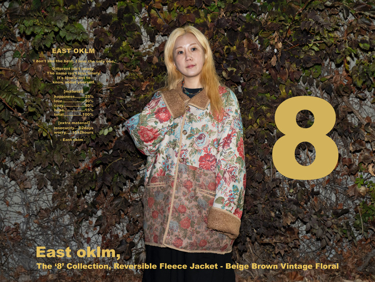 East oklm의 ‘8’ Collection으로, Beige Brown 톤의 울 혼용 원단과 에스닉한 Vintage Floral 패턴 안감을 조합해 양면 모두 활용할 수 있도록 완성된 리버서블 플리스 자켓 상품.