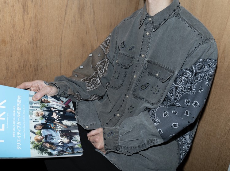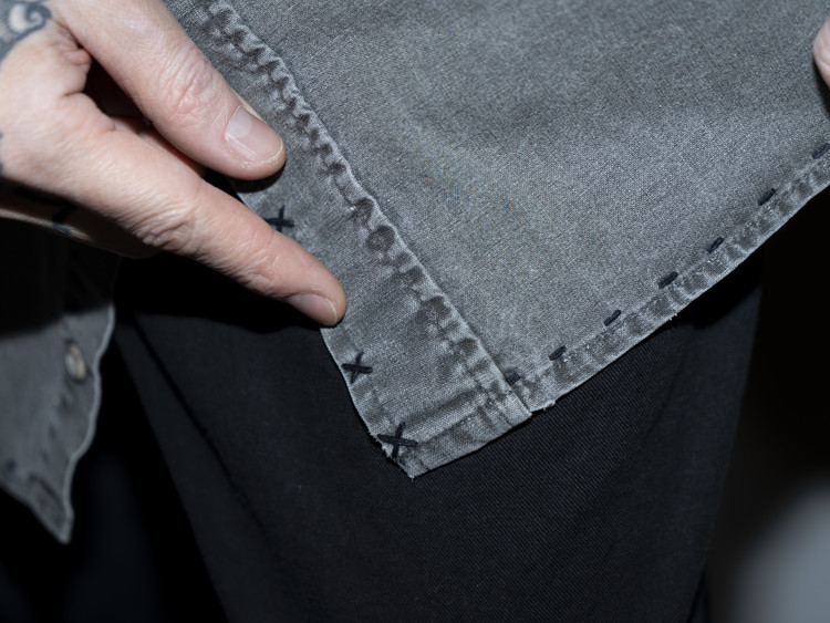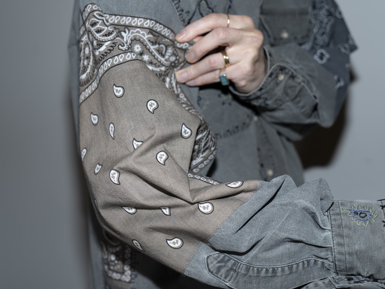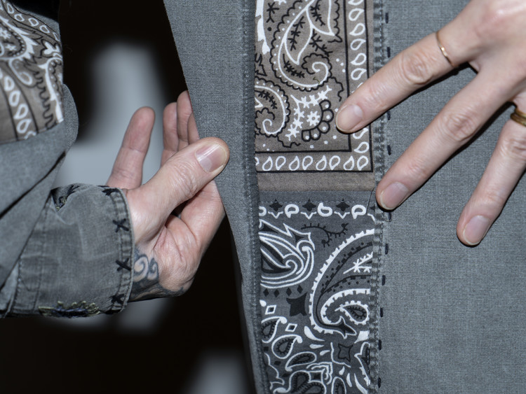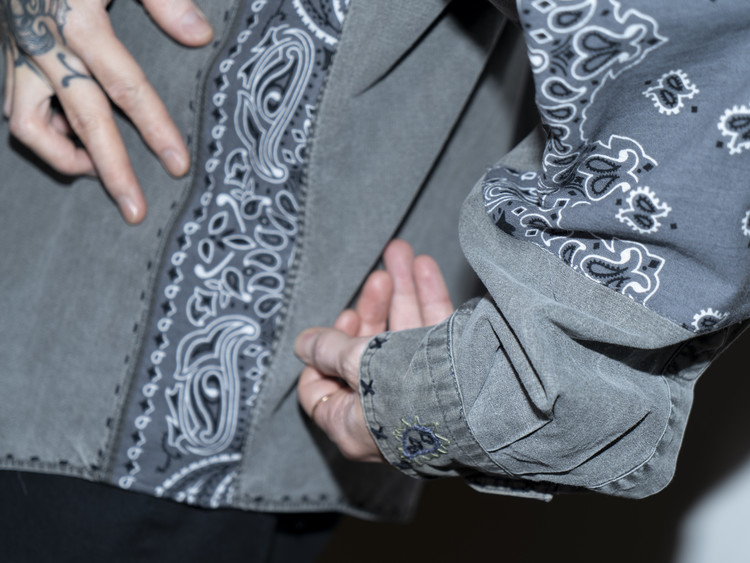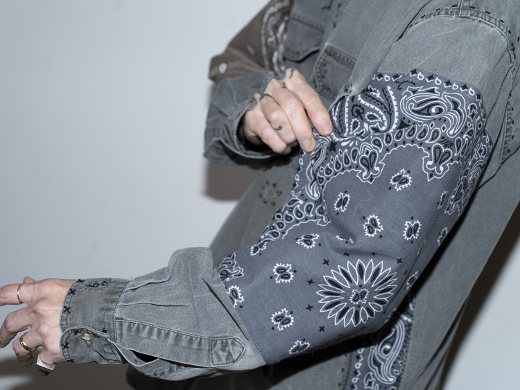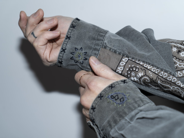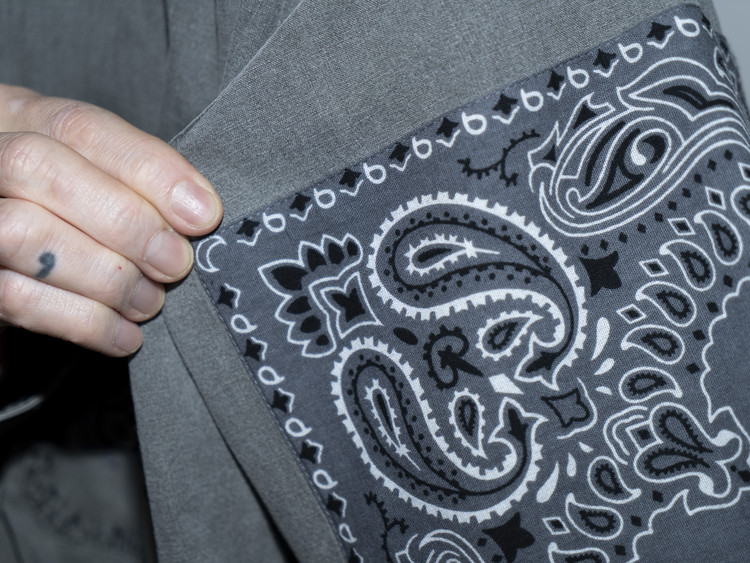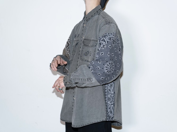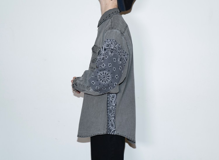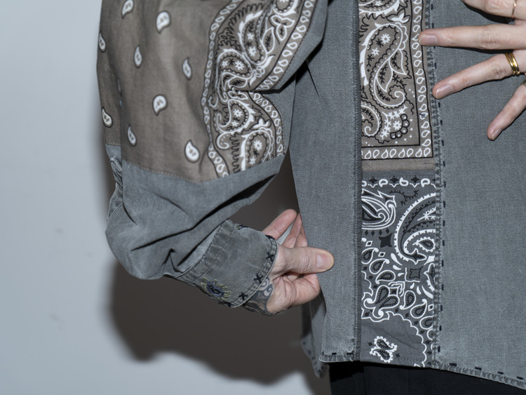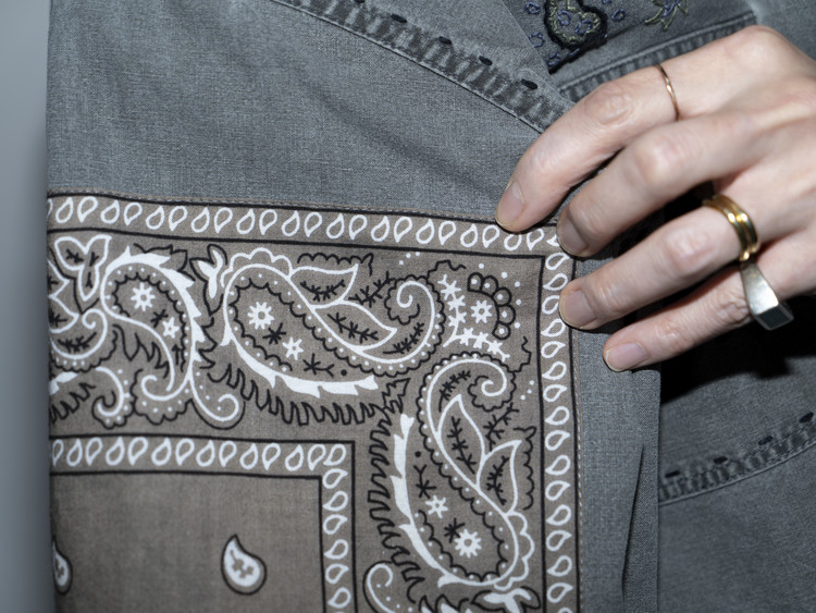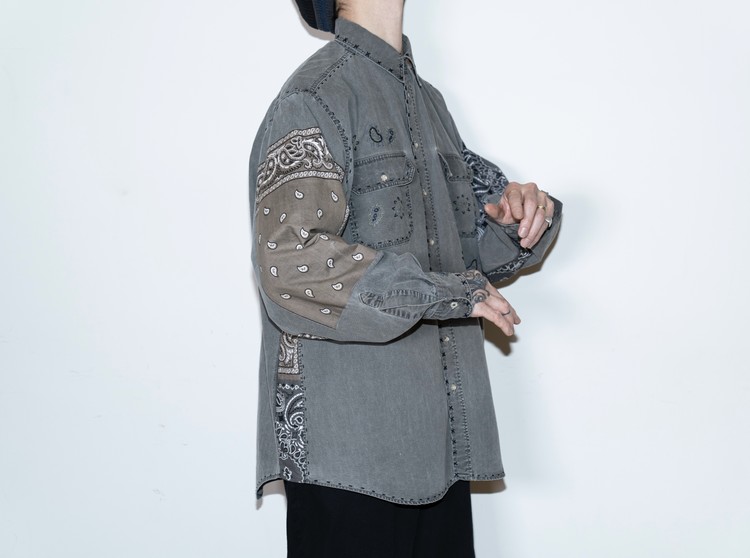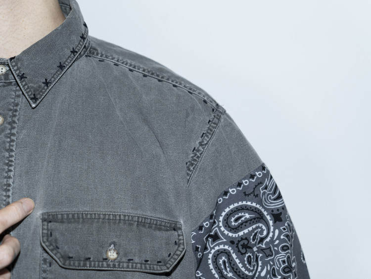 전체적으로 빈티지한 그레이 색상에 맞춰 반다나 또한 빈티지한 그레이 컬러의 Fast color 반다나를 이용하였으며, 서로 다른 문양과 세월감으로 자리하고, 옆을 채운 반다나는 두겹을 사용하여 셔츠의 두께감과 맞춰 작업 하였습니다.