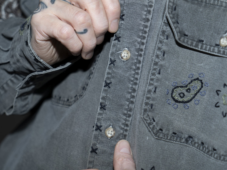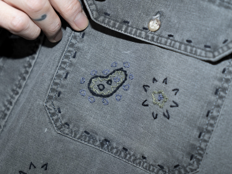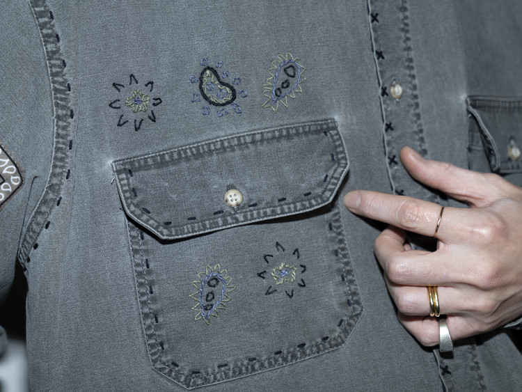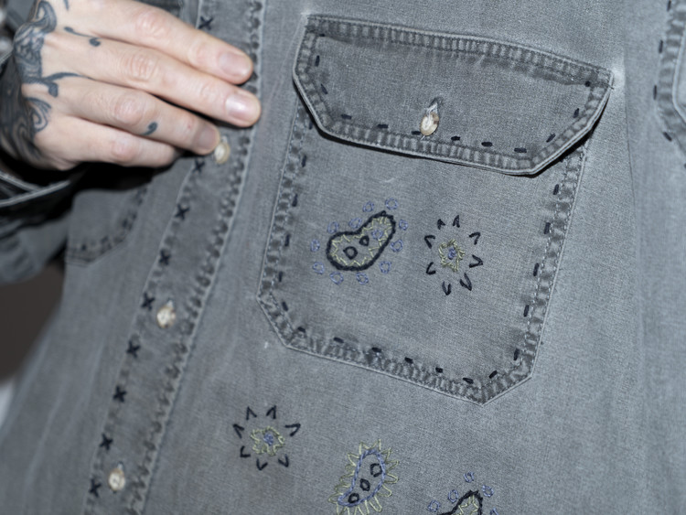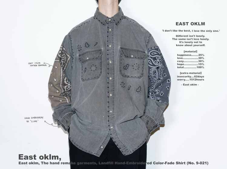 East oklm, The hand remake garments로 컬러 페이드된 견고한 코튼 패브릭 원단의 빈티지한 그레이 색상 Wool Rich 셔츠에 Landfill 작업과 Hand-Embroidered로 완성된 상품.