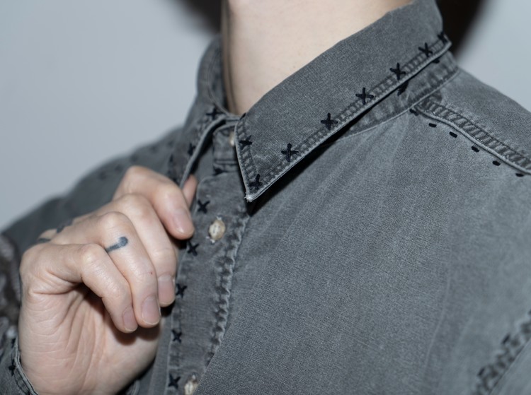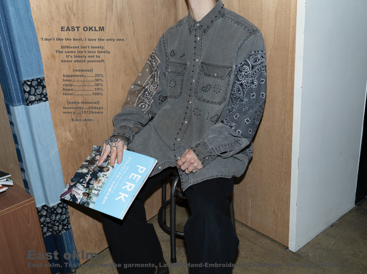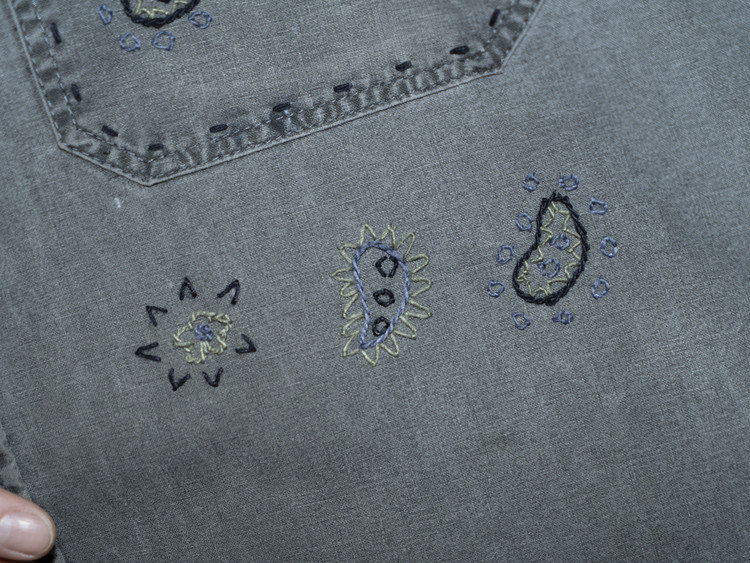 또한 셔츠 전반적으로 두께감이 있는 실을 활용하여 끝단과 봉제가 맞닿은 부분들, 소매 커프스 등에 핸드 스티치 작업을 하였으며, 반다나에서 볼 수 있는 아메바, 태양 문양들을 East oklm,만의 표현을 더해 올리브, 블랙, 그레이 색상의 실로 표현하였습니다.
