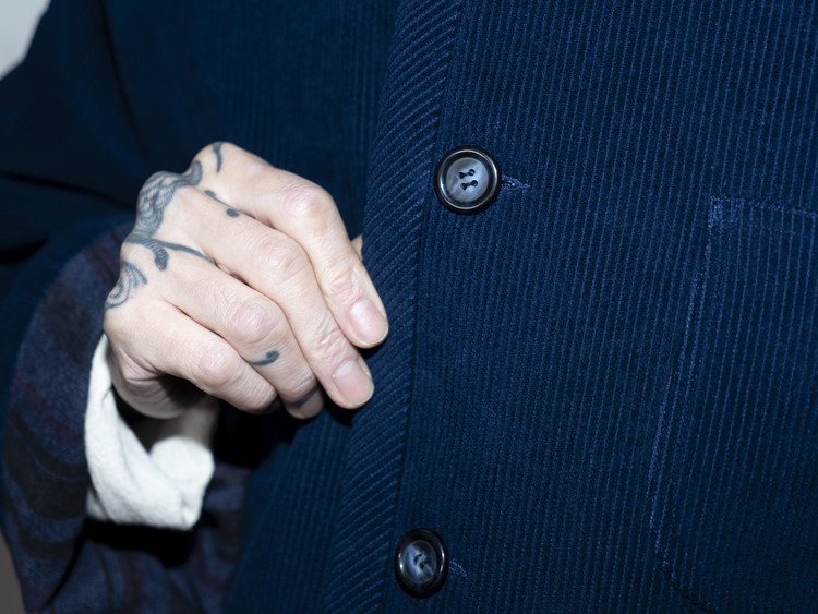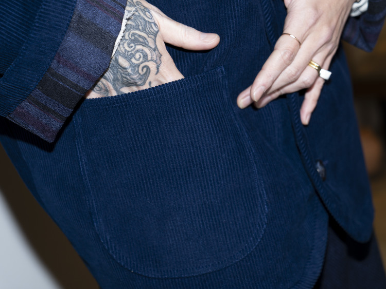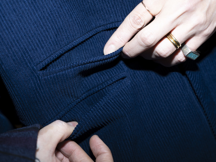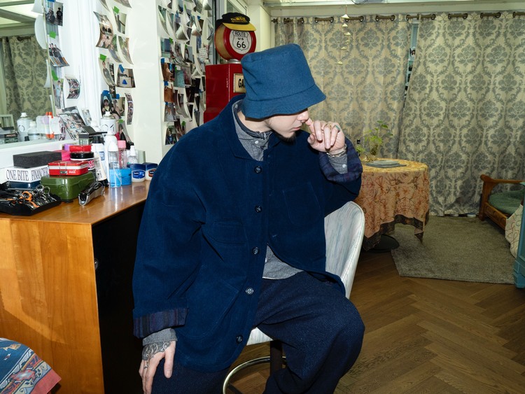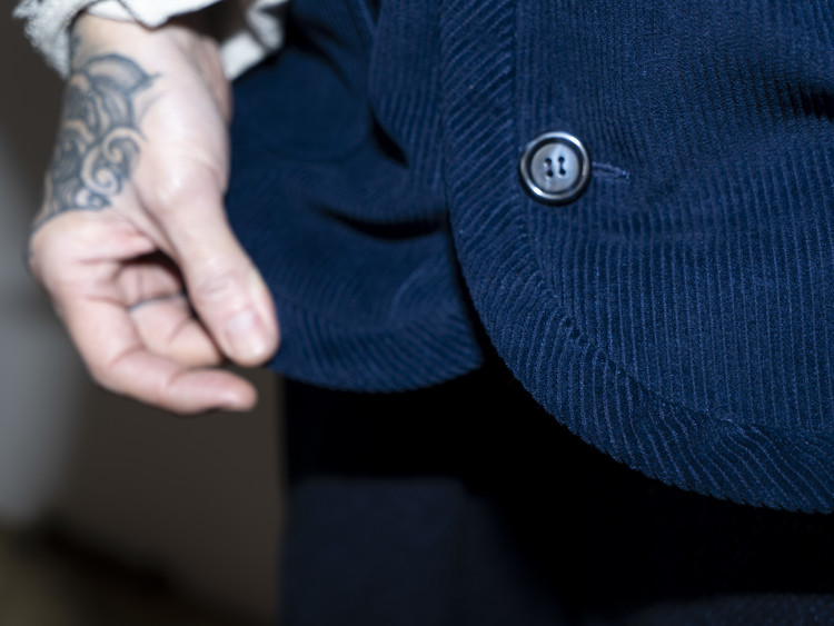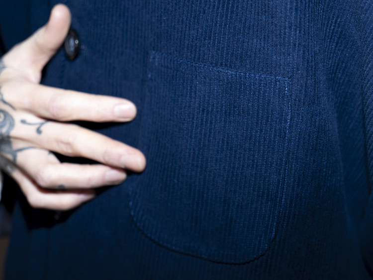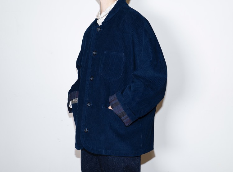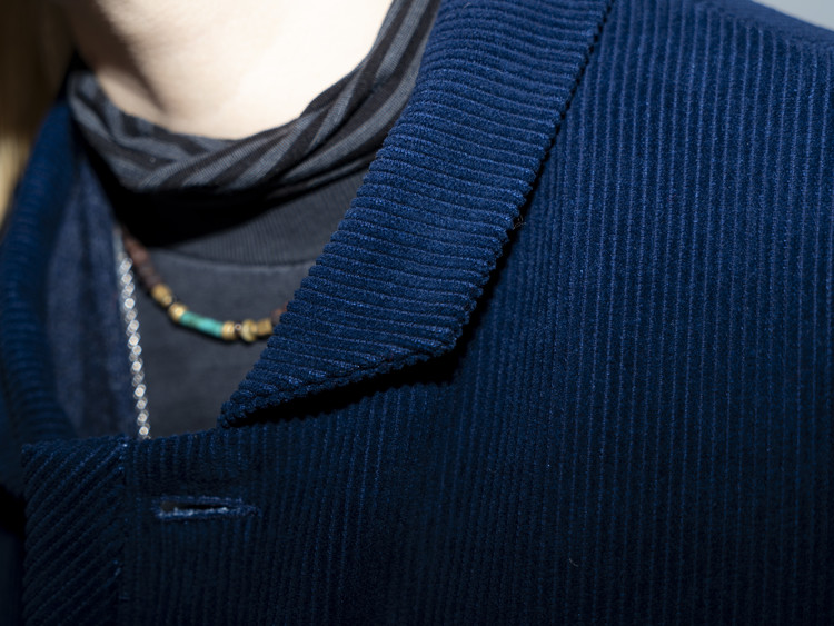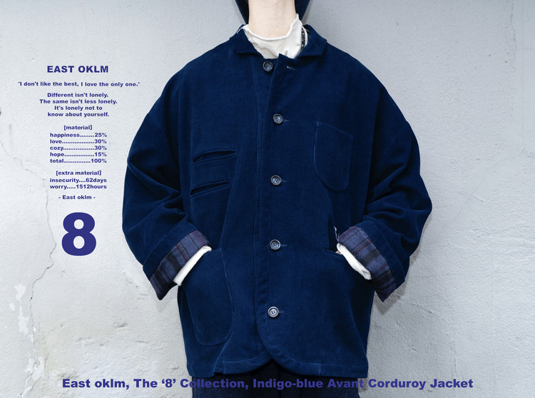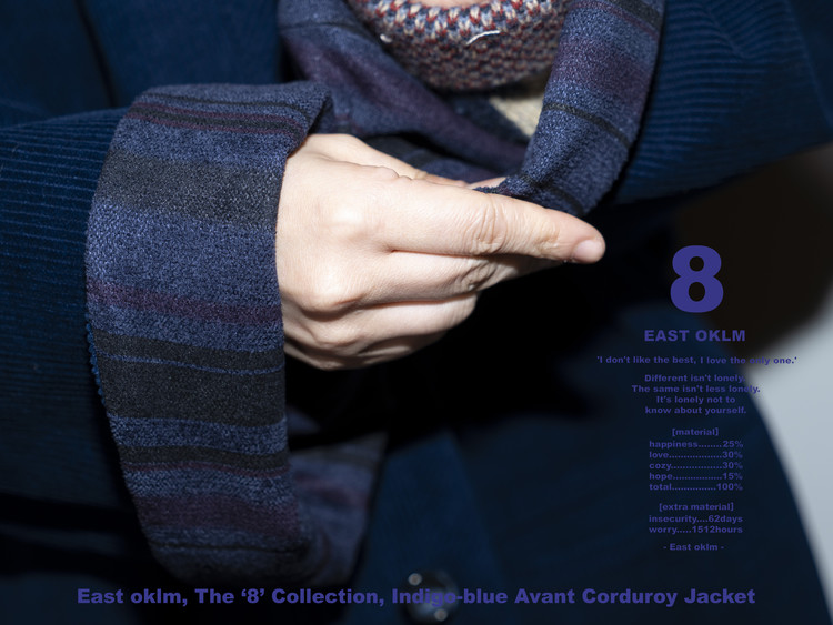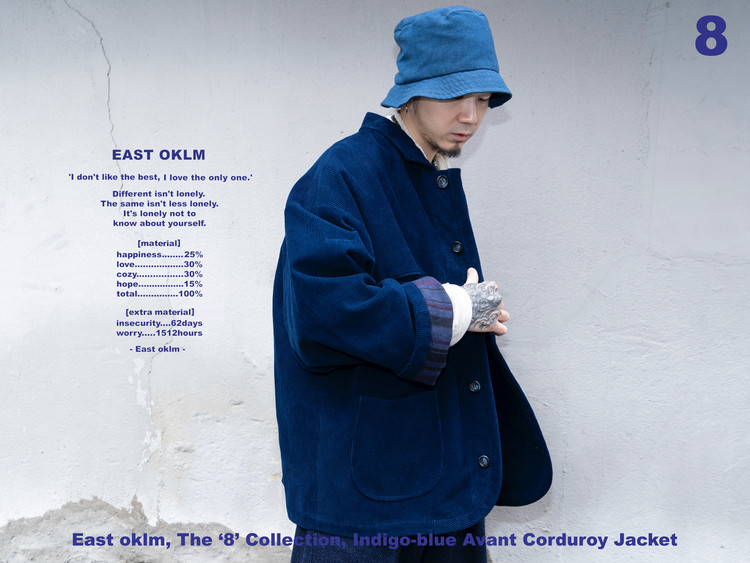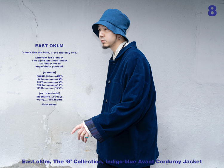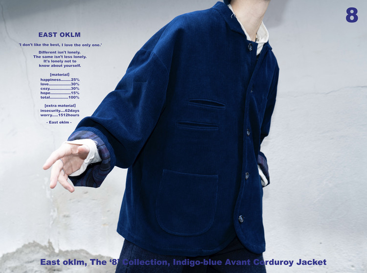 Indigo 다잉과 바이오 워싱 과정을 거쳐 완성된 코듀로이 원단으로 제작된, East oklm, The ‘8’ Collection의 아방가르드 실루엣 자켓입니다.