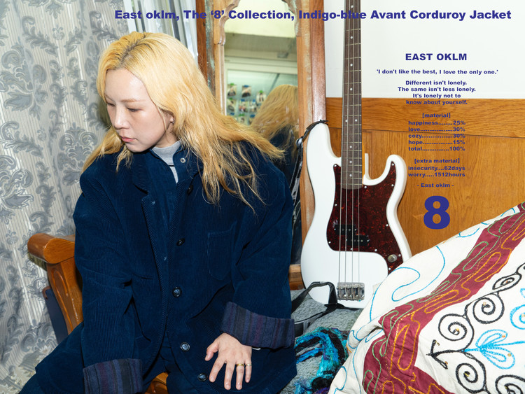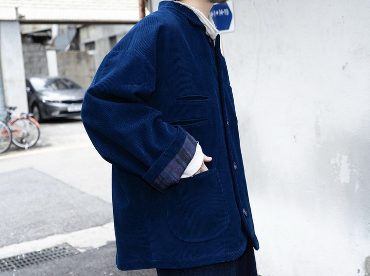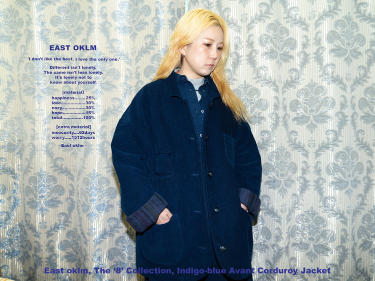 전체적으로 여유로운 라인으로 떨어지며, 코듀로이에 담긴 인디고-블루 톤은 East oklm,이 지향하는 고유의 색감으로 표현되었습니다.