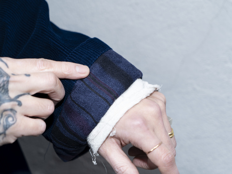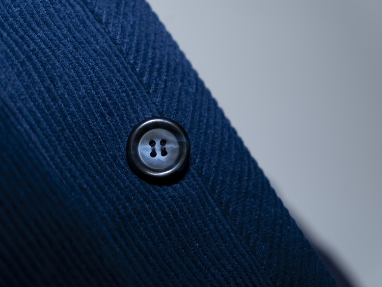 소매 끝단은 넓게 디자인되어 아방가르드한 무드를 더하며, 끝단을 접어 안감을 살짝 드러내어 연출할 수 있는 여지를 제공합니다. 네이비 톤의 단추는 은은한 광택과 패턴을 지녀 전체적인 색감과 자연스럽게 어우러집니다.
