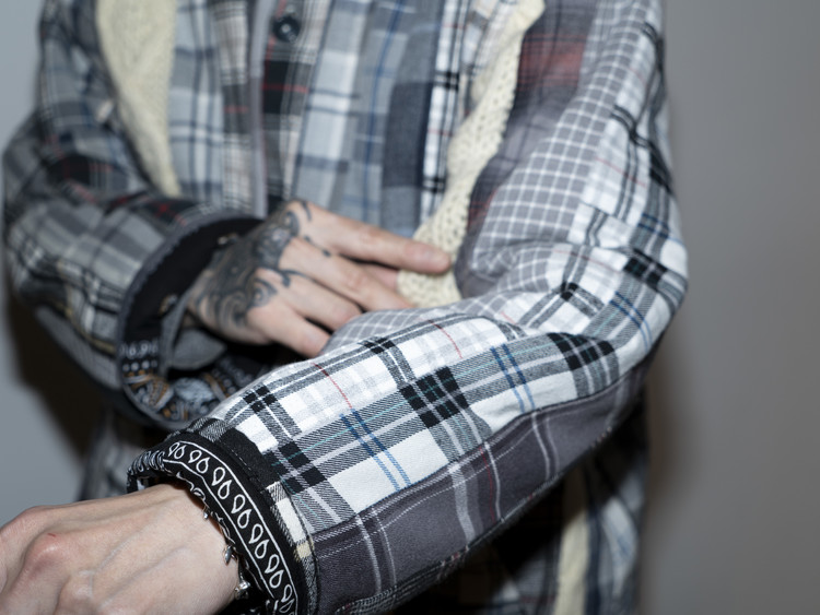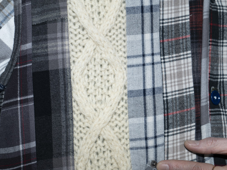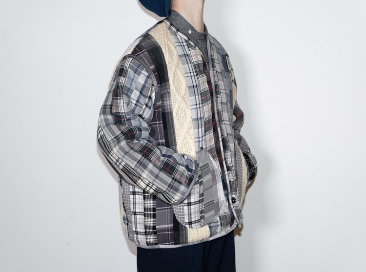 겉면은 주로 그레이 컬러를 중심으로 한 레트로한 체크 패턴의 빈티지 플란넬 셔츠들과 서로 다른 질감의 빈티지 니트 조각들을 해체한 뒤, 세로로 길게 이어지는 패널 형태로 하나하나 연결하여 구성하였습니다.
