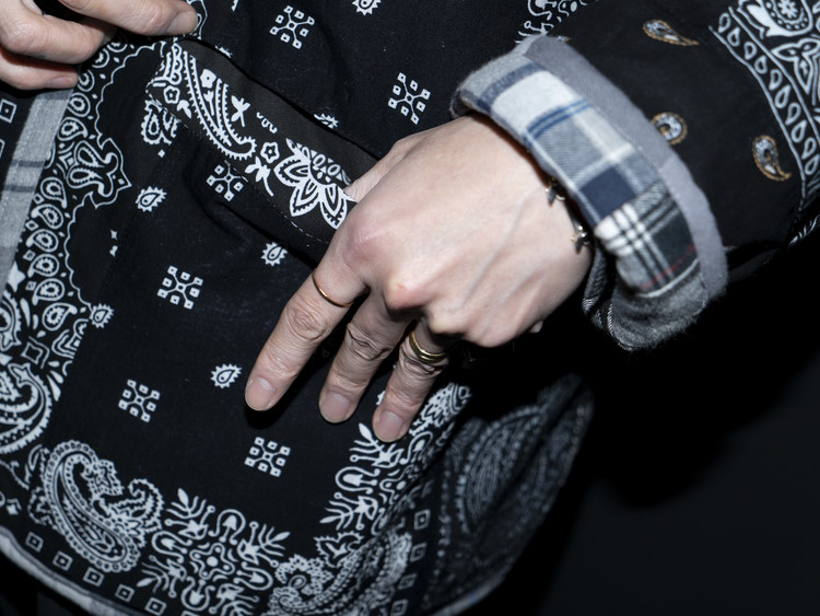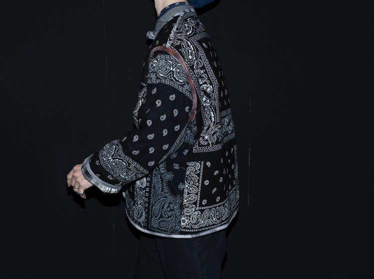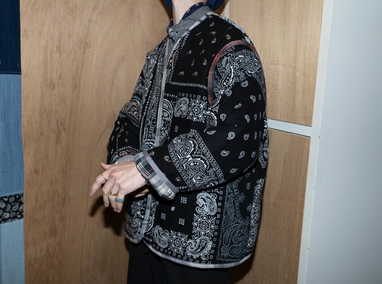 안쪽 면은 블랙 컬러를 중심으로 한 빈티지 반다나 조각들로 구성되어, 뒤집어 착용했을 때 또 다른 표정을 보여줍니다.