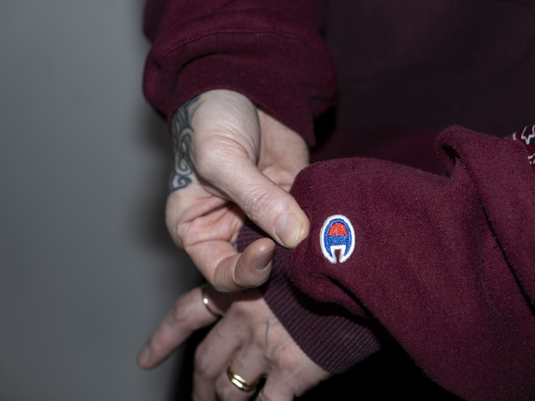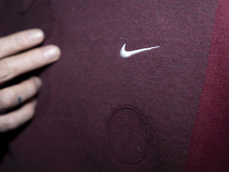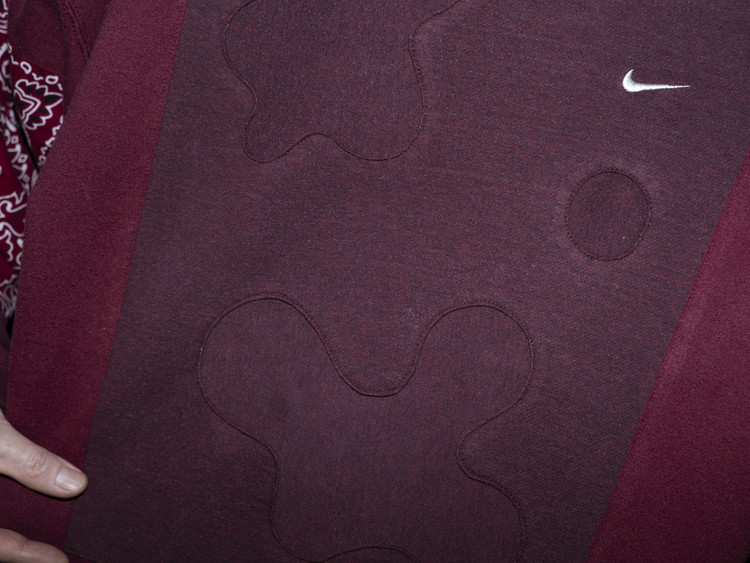 같은 버건디 색상이나 톤차이가 나는 스웻셔츠들을 이용하여 적절한 차이감이 보이도록 하였으며, 왼쪽 가슴에 위치한 나이키 스우스 자수와 오른쪽 소매 끝단, 앞판 아래 위치한 챔피온 로고들을 확인할 수 있습니다.