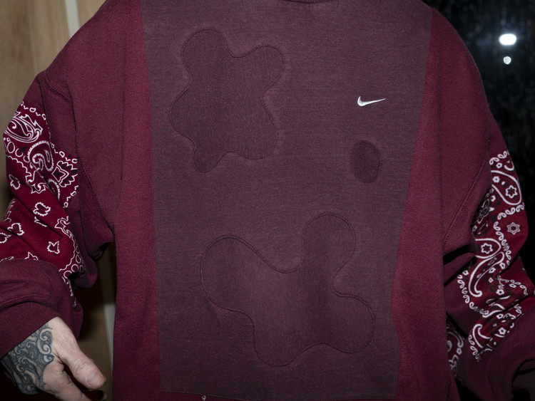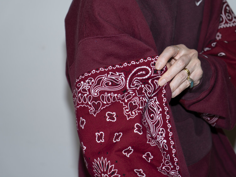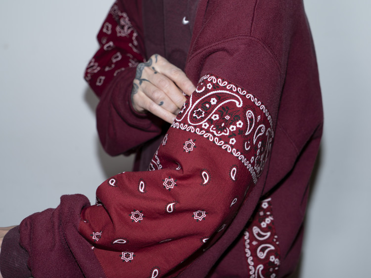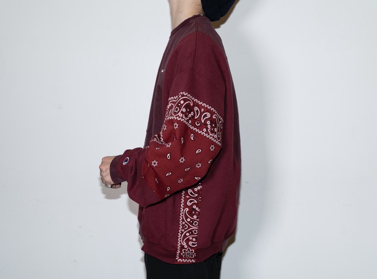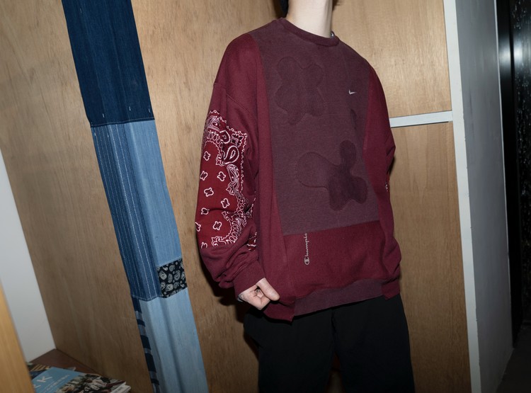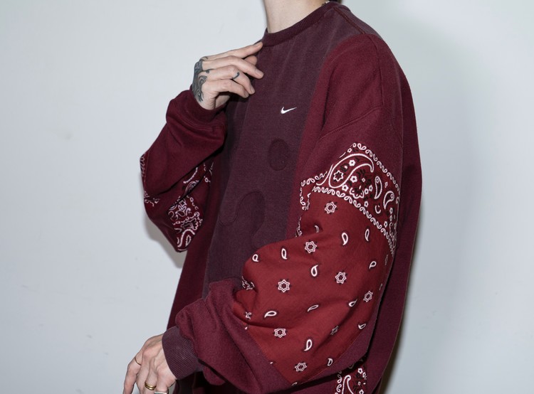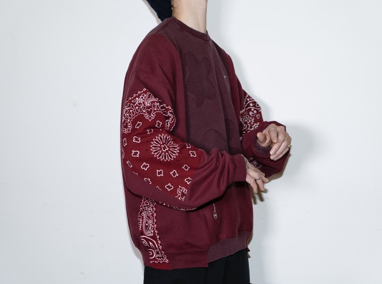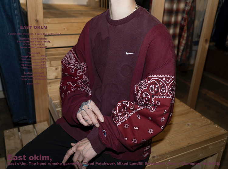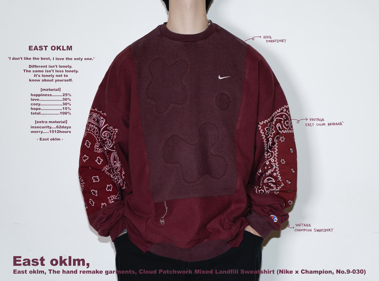 East oklm, The hand remake garments로 빈티지 나이키, 챔피온 스웻셔츠들을 해체하고 재구성하여 구름 모양의 안쪽 패치워크와 반다나로 포인트를 만든 제품.