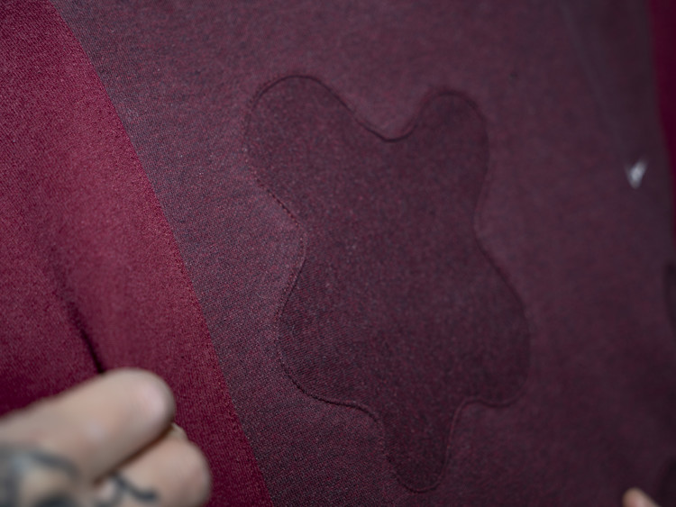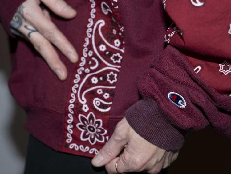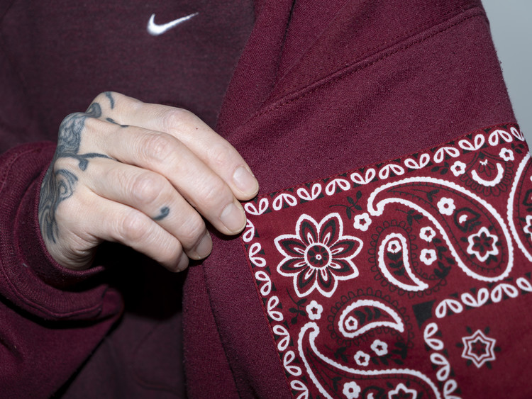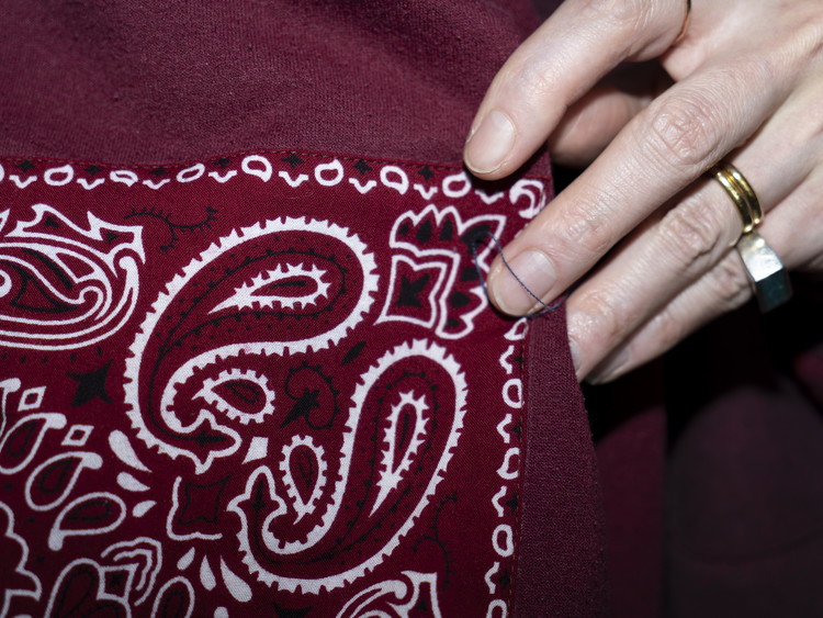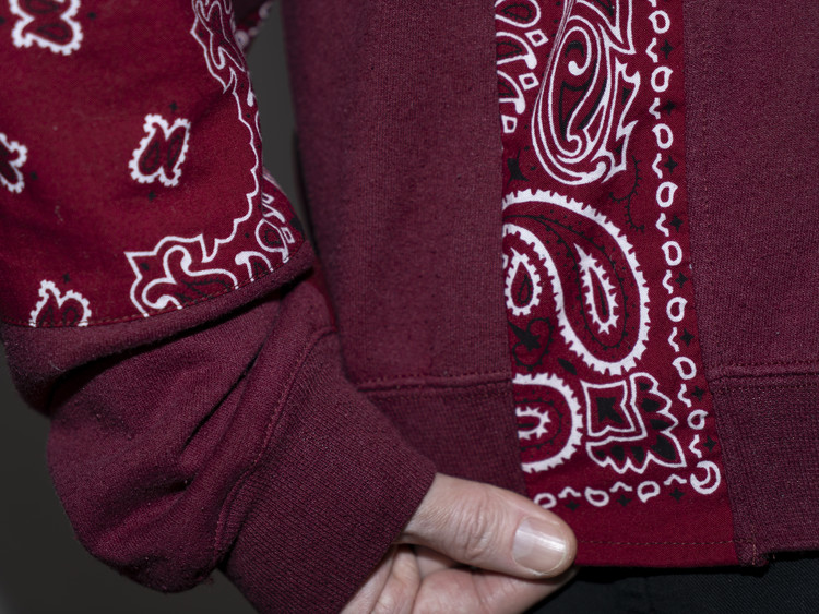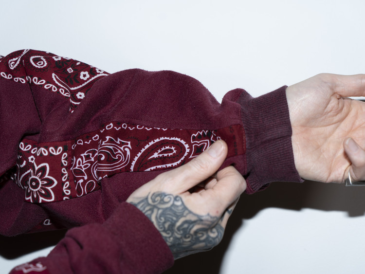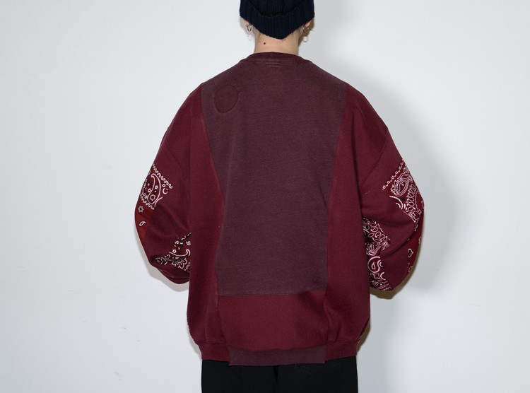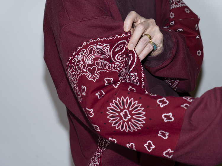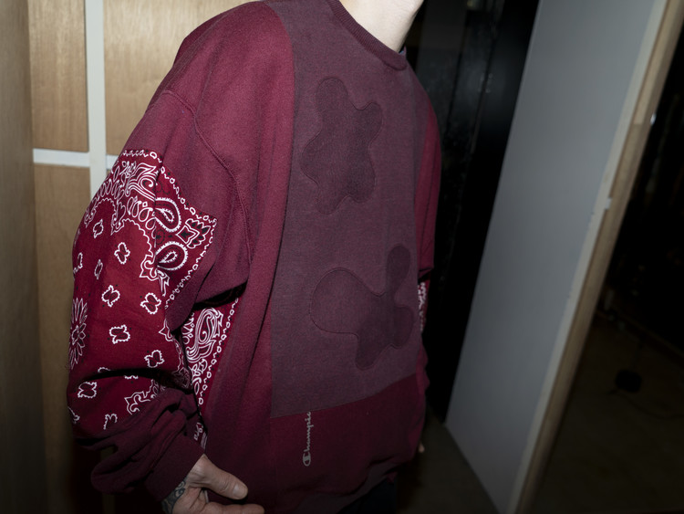 East oklm, The hand remake garments로 빈티지 나이키, 챔피온 스웻셔츠들을 해체하고 재구성하여 구름 모양의 안쪽 패치워크와 반다나로 포인트를 만든 제품.