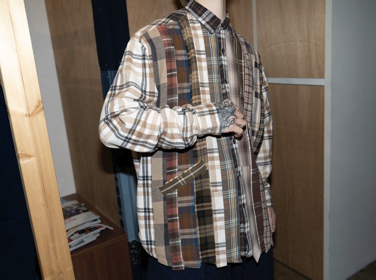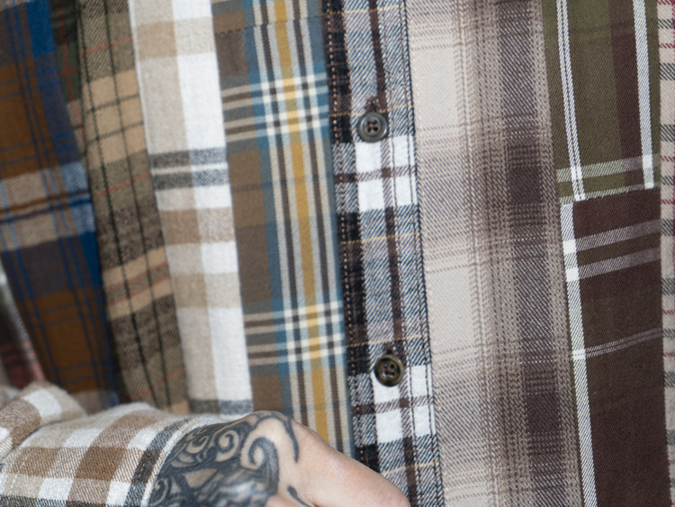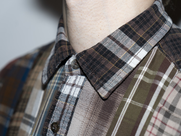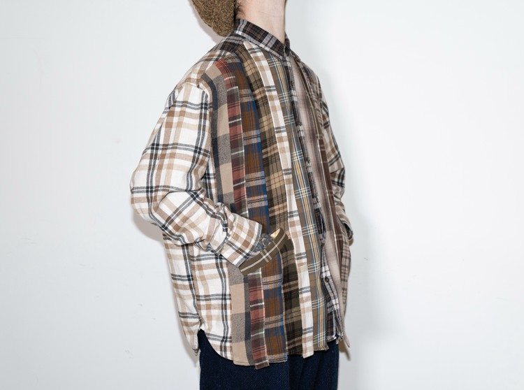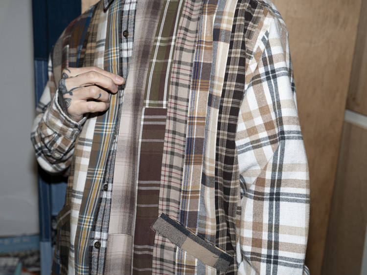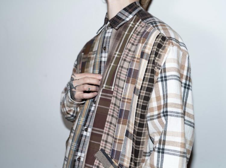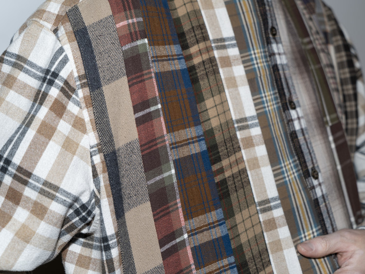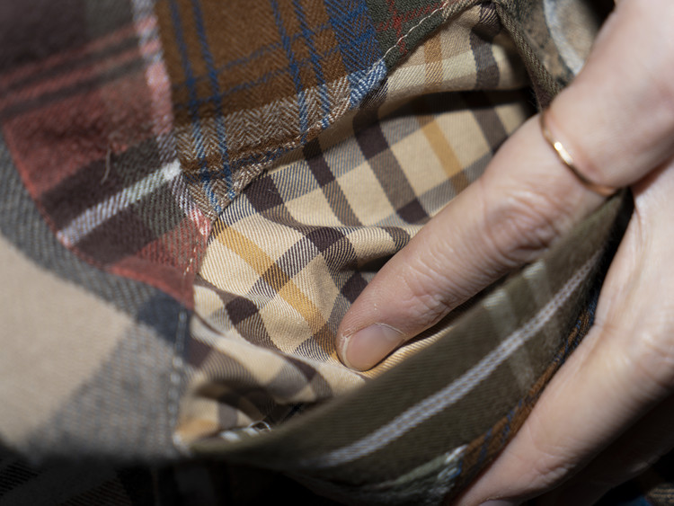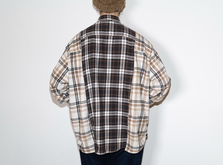 빈티지 특유의 체크 패턴과 색감을 살려 주로 빈티지한 브라운 계열 색상 플란넬 셔츠 조각들을 연결해 서로 너비가 다른 세로 라인의 흐름을 강조한 구조감을 확인할 수 있습니다.