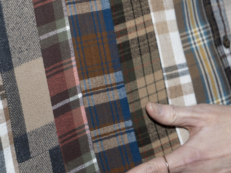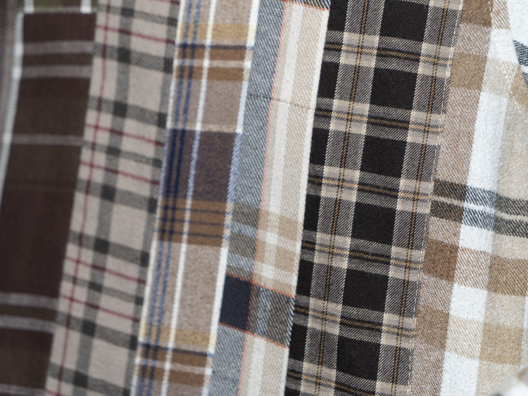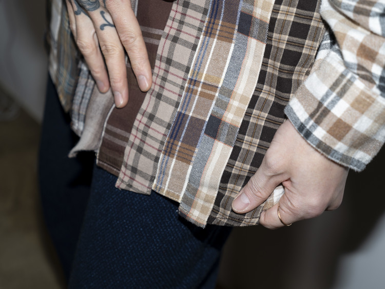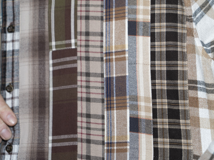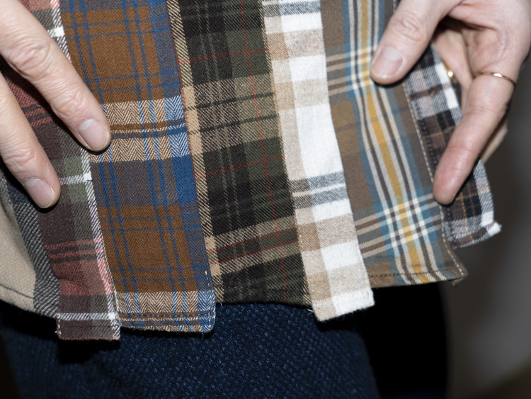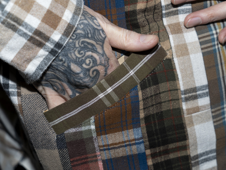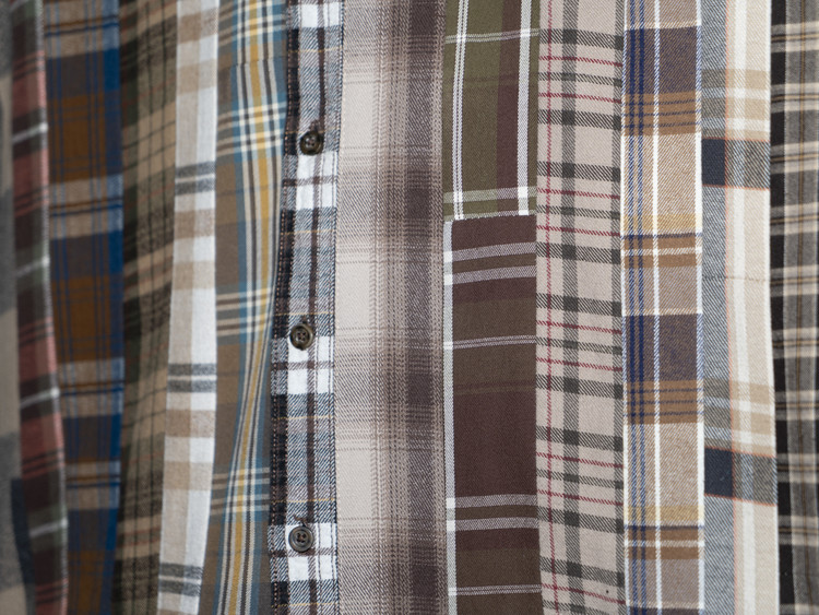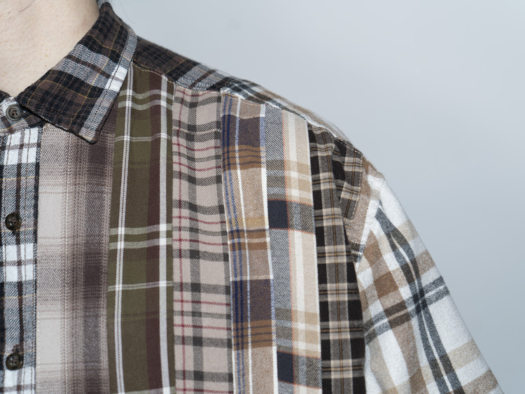 빈티지 특유의 체크 패턴과 색감을 살려 주로 빈티지한 브라운 계열 색상 플란넬 셔츠 조각들을 연결해 서로 너비가 다른 세로 라인의 흐름을 강조한 구조감을 확인할 수 있습니다.