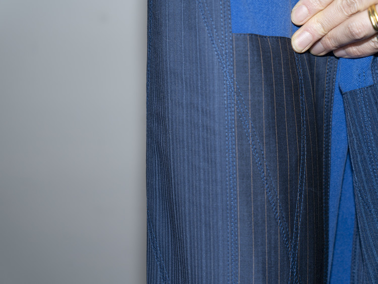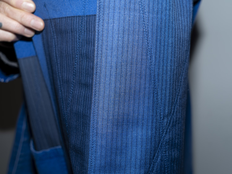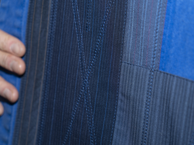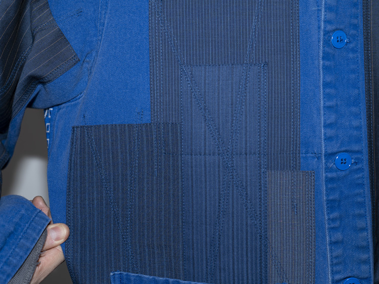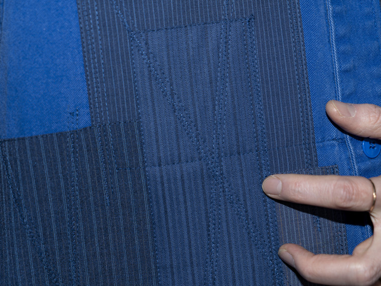 빈티지한 블루 색상을 가진 프렌치 워크자켓에 블루, 네이비 색상 계열의 테일러 원단들을 활용하여 색감의 조화와 안정감있는 패치워크를 볼 수 있습니다.