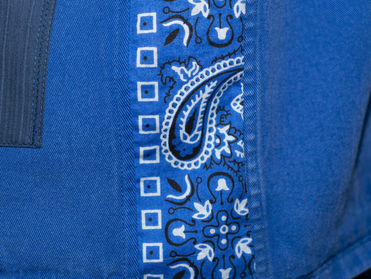 옆을 채운 블루 색상의 Fast color 빈티지 반다나는 반대편에 네이비 색상의 반다나로 두겹을 겹쳐 사용하여 두께감을 맞춰 주었으며, 이는 여유로운 실루엣의 역할이자, 움직임과 함께 보여질 부분으로 자리 합니다.