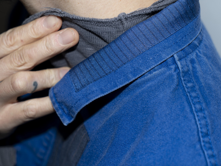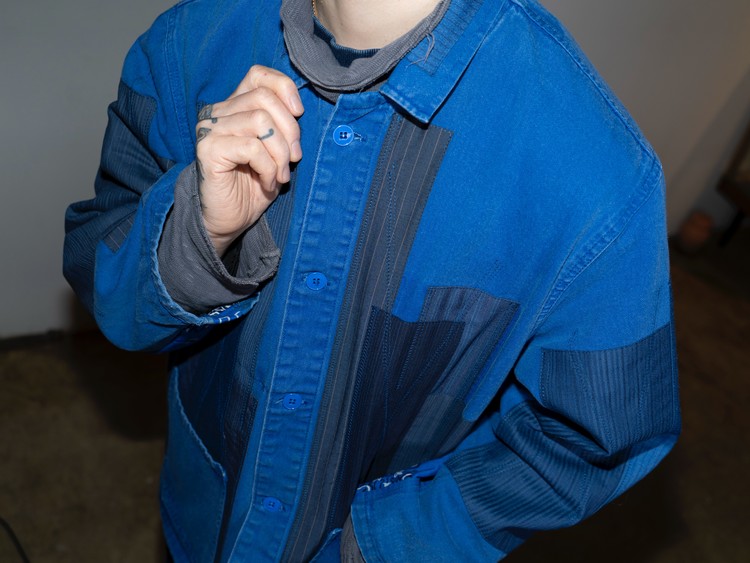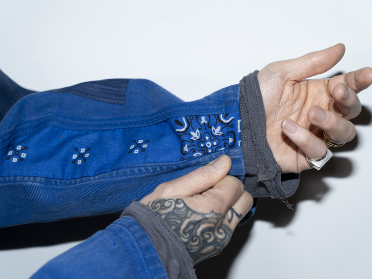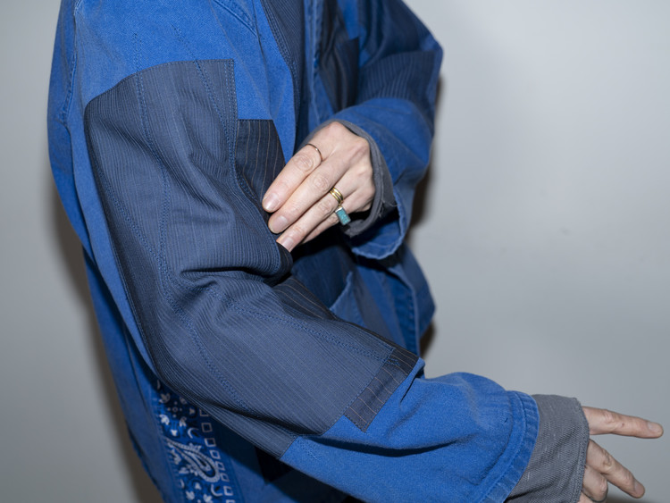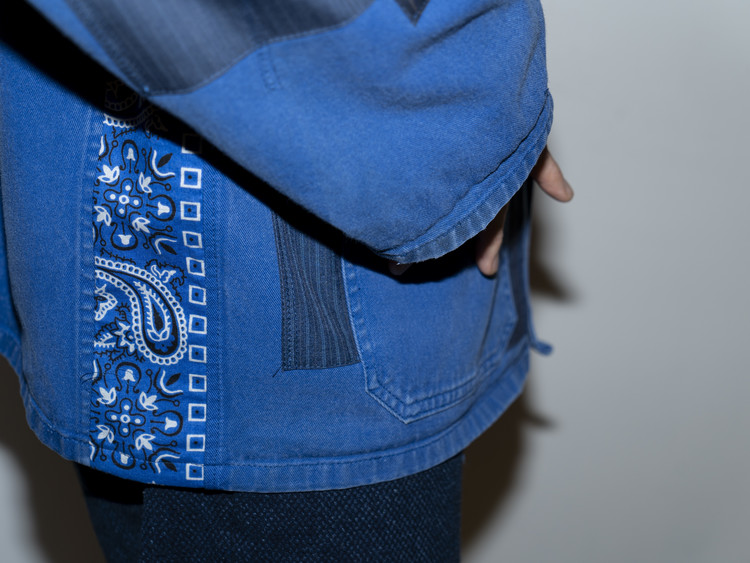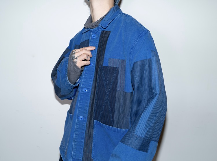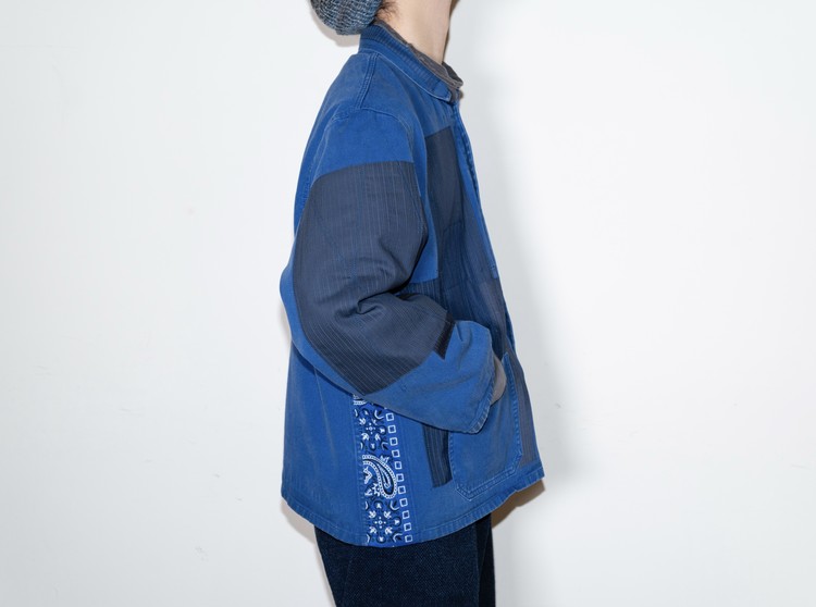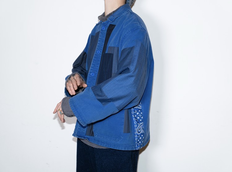 East oklm, The hand remake garments로 인상적인 세월감을 가진 블루 색상의 빈티지 프렌치 워크웨어에 테일러 원단의 패치워크와 옆을 채운 반다나로 만들어진 리메이크 자켓 제품.