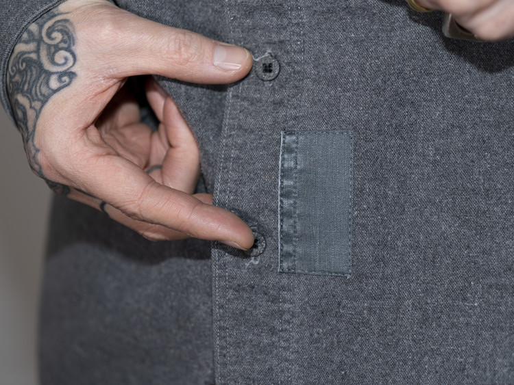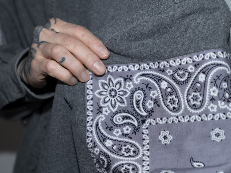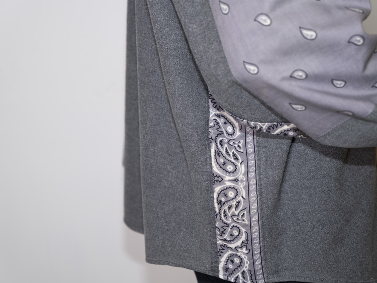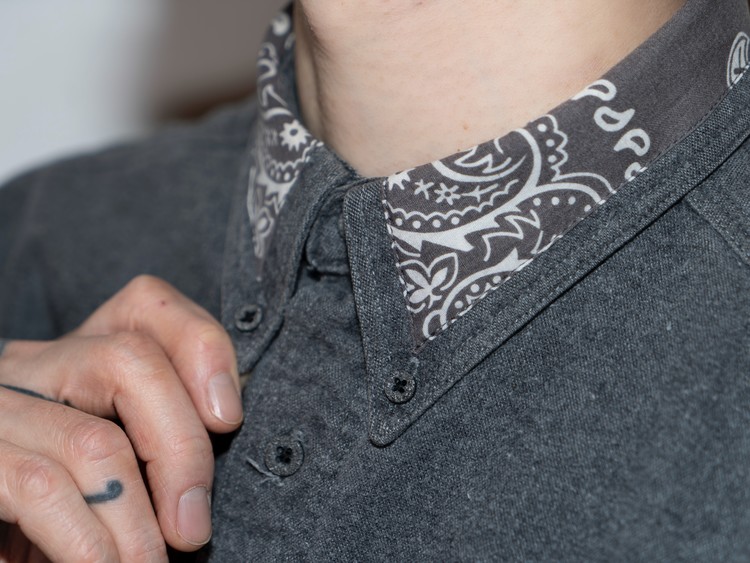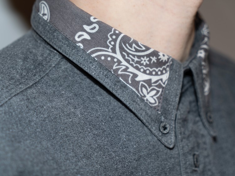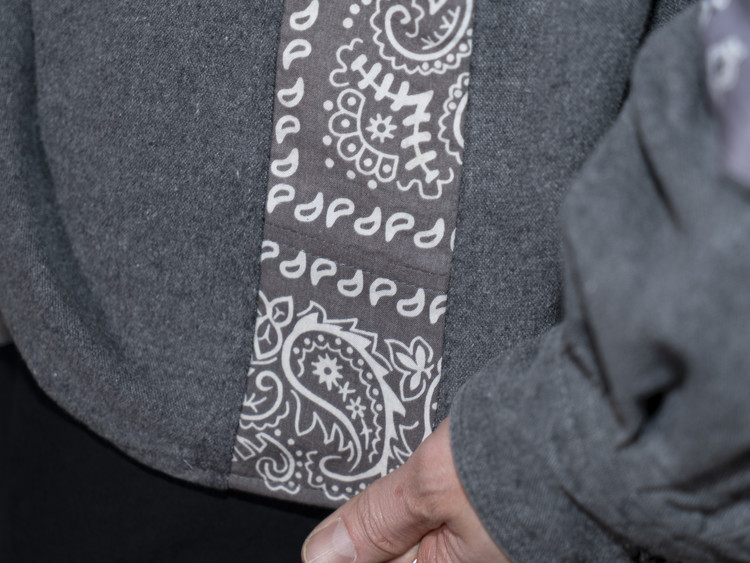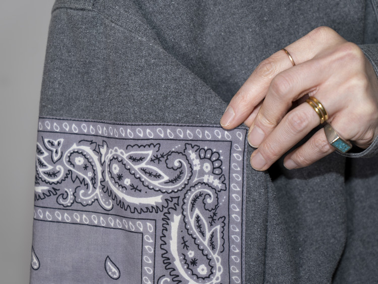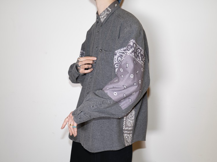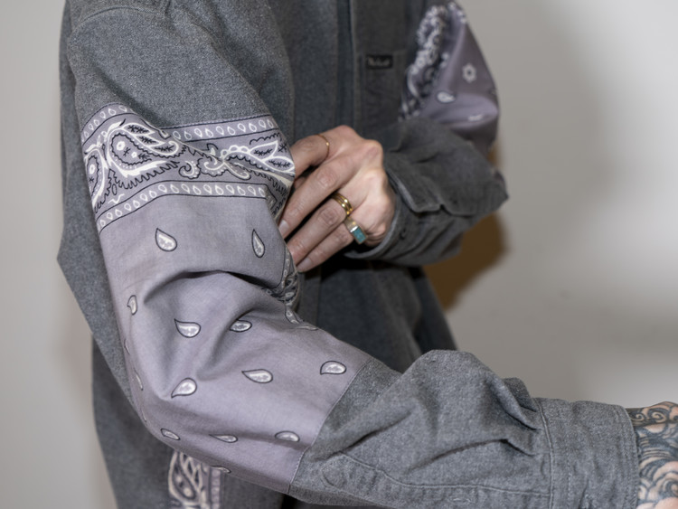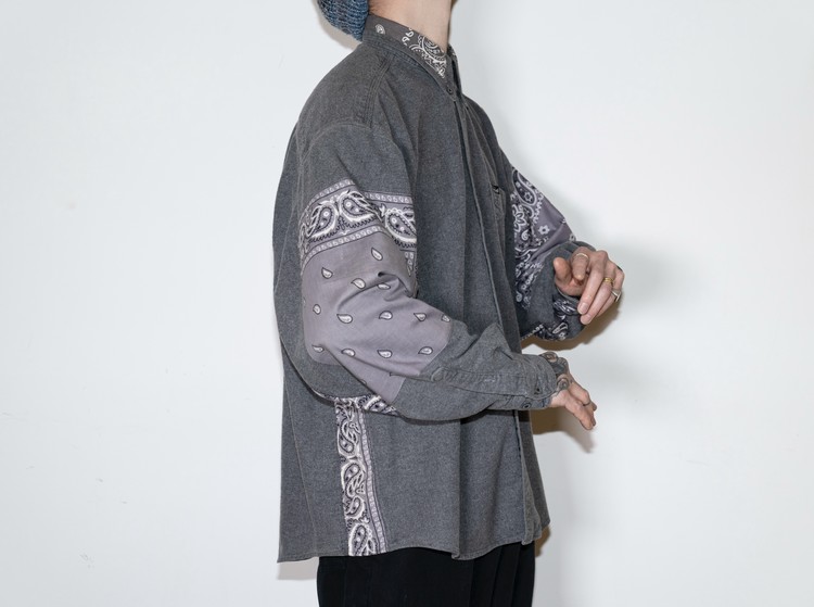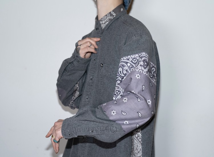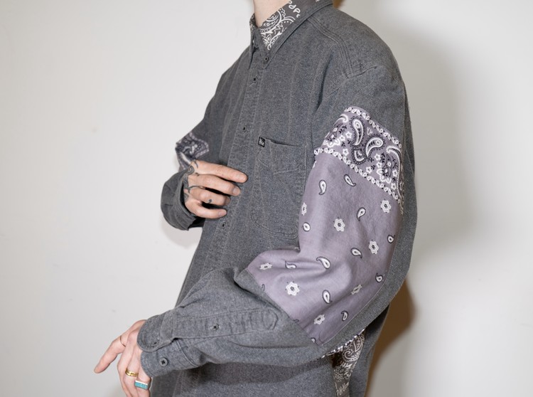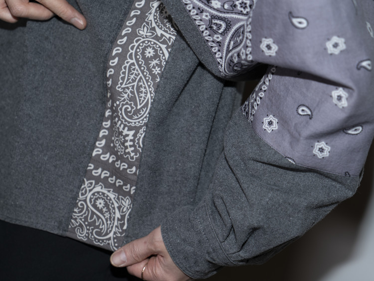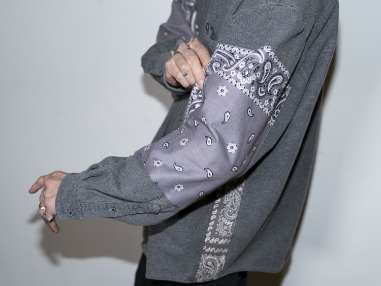 기모 처리로 부드러움과 따뜻한 촉감을 가진 적절한 두께감의 셔츠는 그레이 색상으로 양쪽 소매와 카라 부분에 사용된 빈티지 Fast Color 반다나들과 함께 좋은 조화를 보이며, 옆 라인 역시 반다나 원단을 이중으로 덧대어 전체적인 두께감과 안정감을 더했습니다.