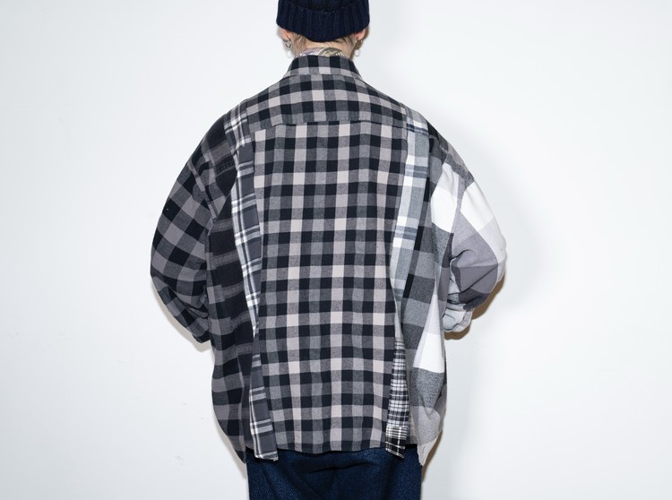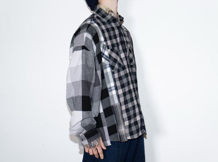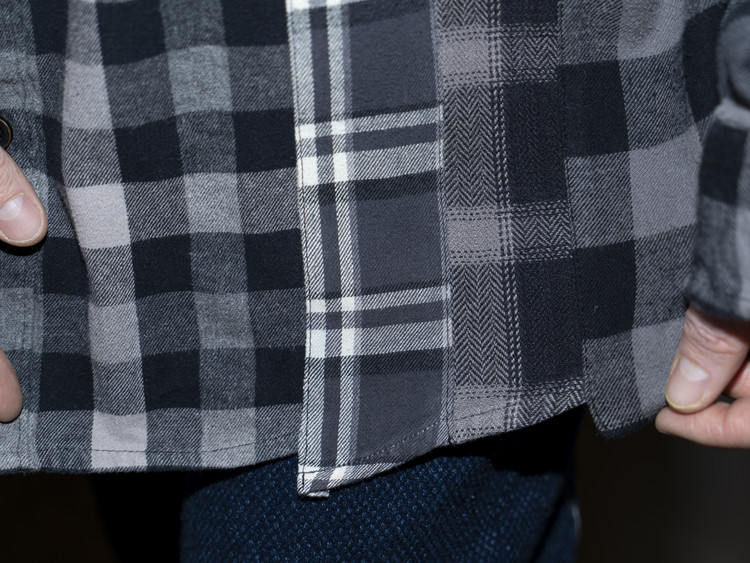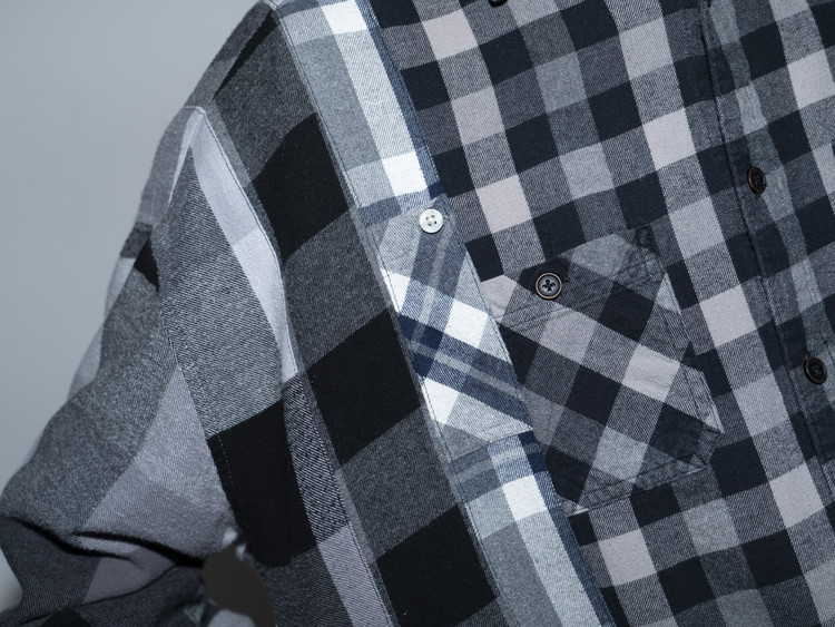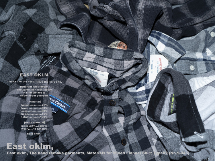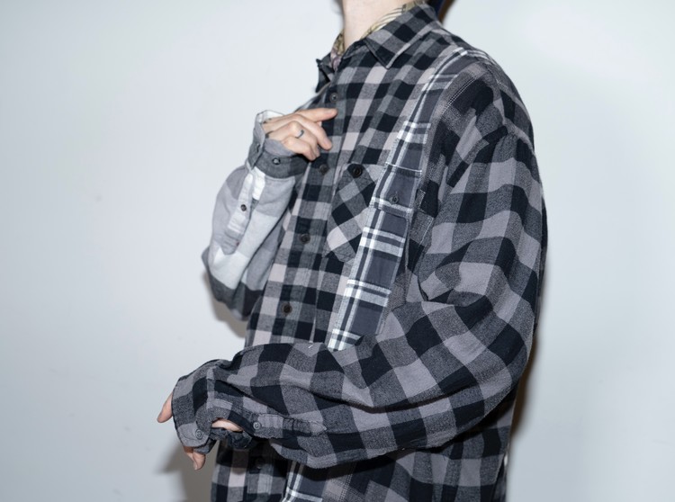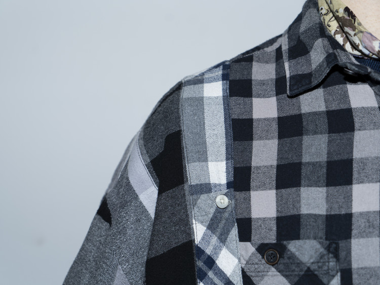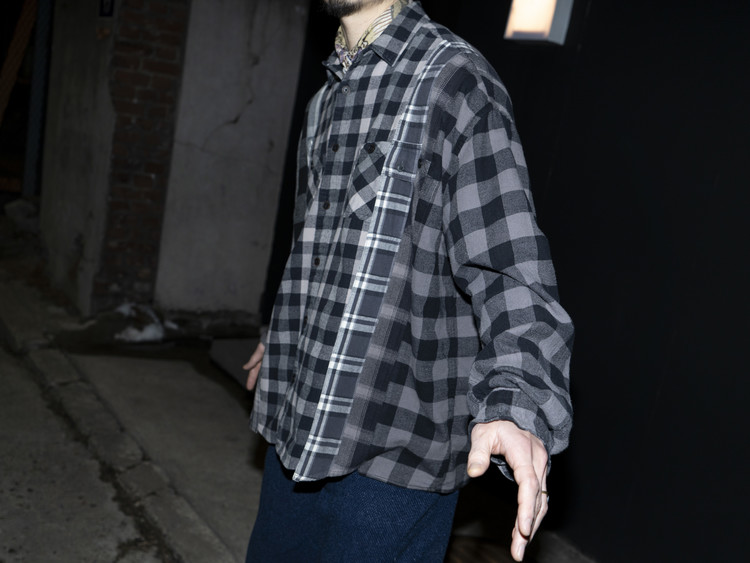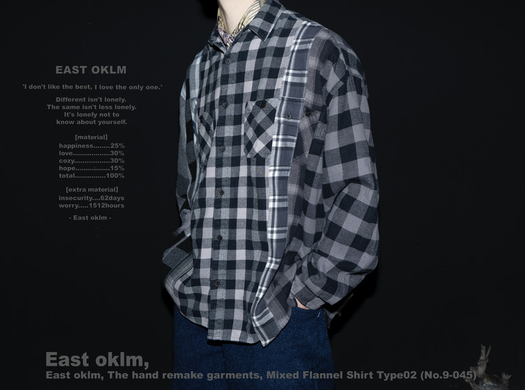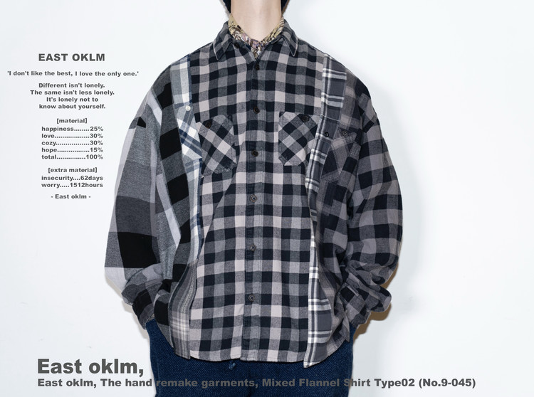 East oklm, The hand remake garments로 여러장의 플란넬 셔츠들을 해체하고 재구성하여 완성된 믹스 셔츠 상품.