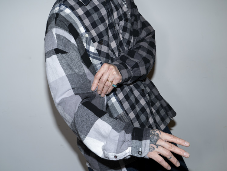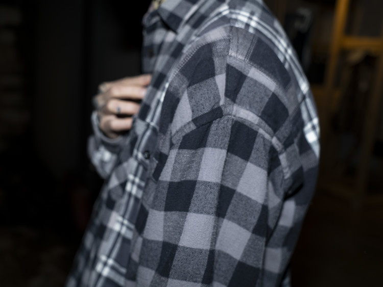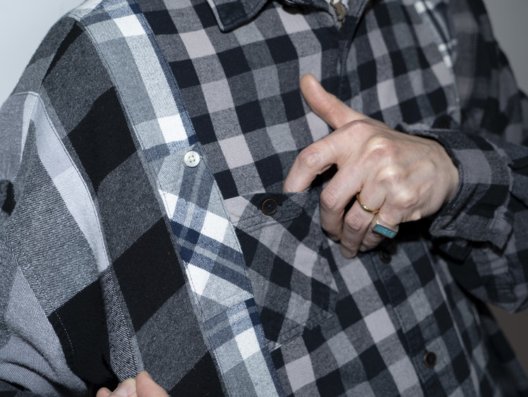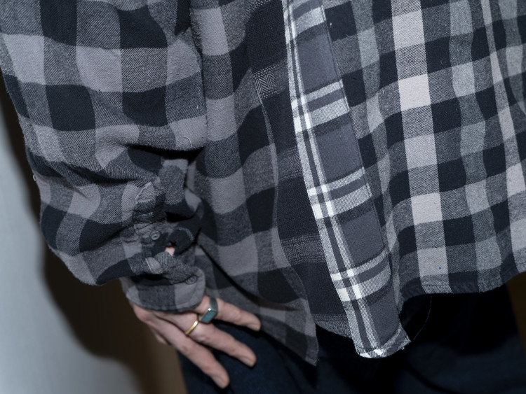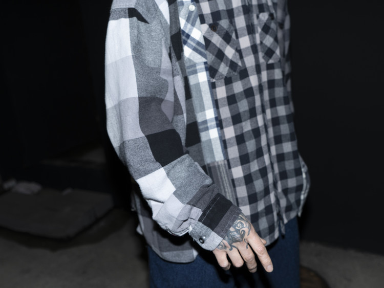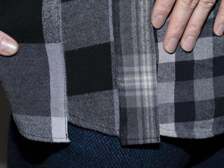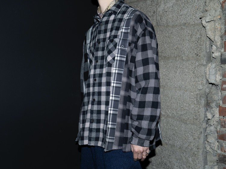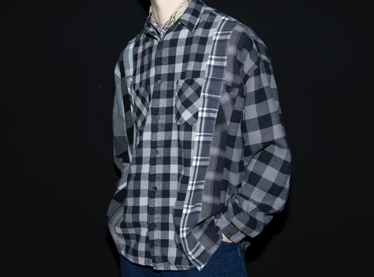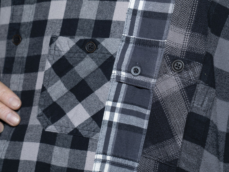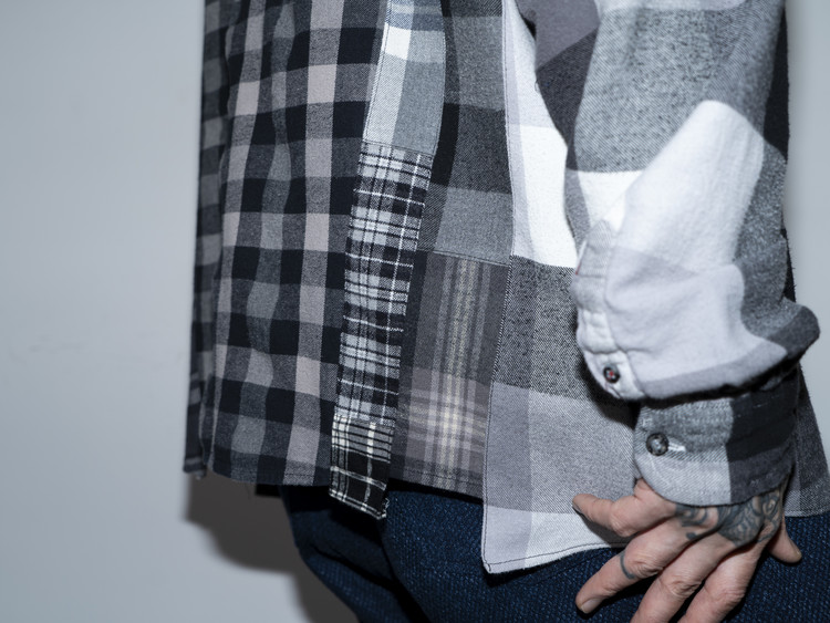 East oklm, The hand remake garments로 여러장의 플란넬 셔츠들을 해체하고 재구성하여 완성된 믹스 셔츠 상품.