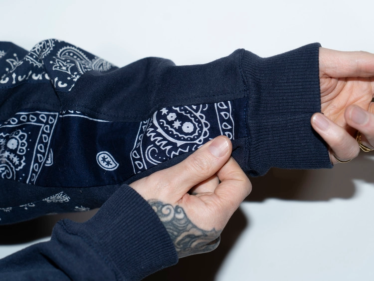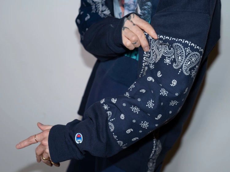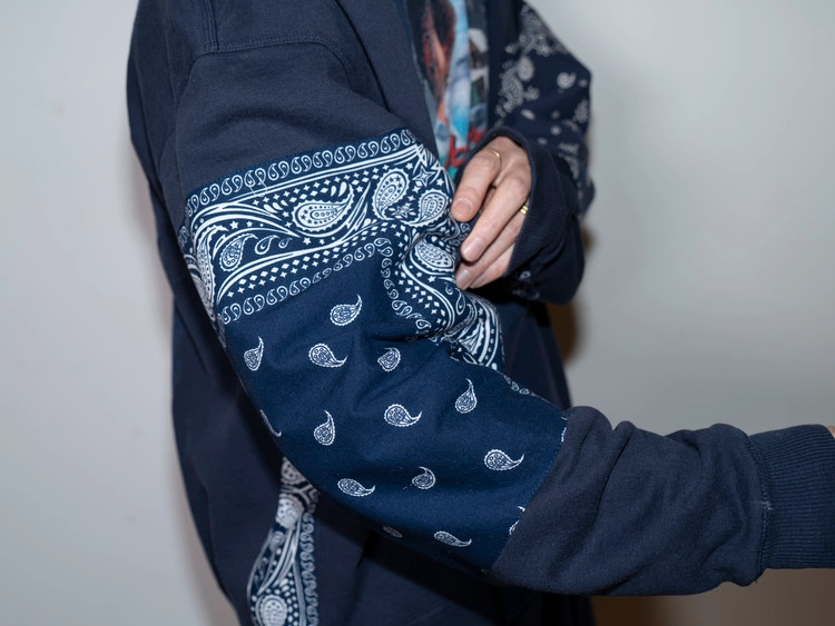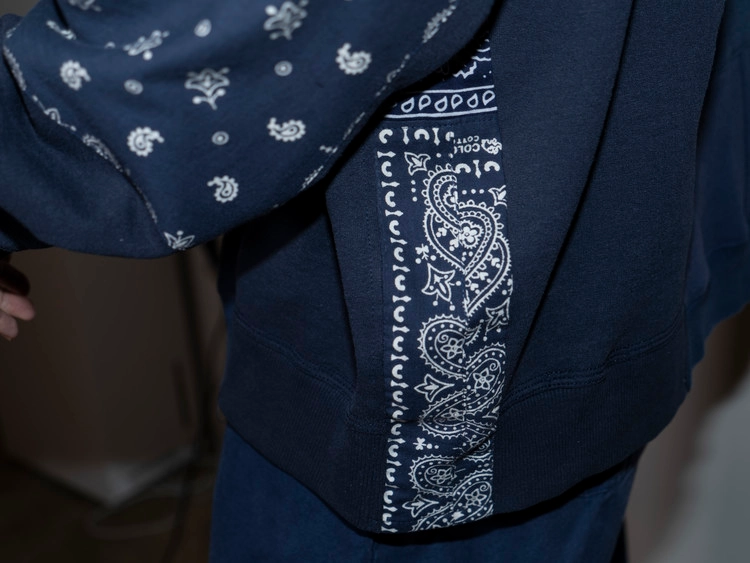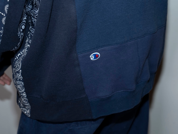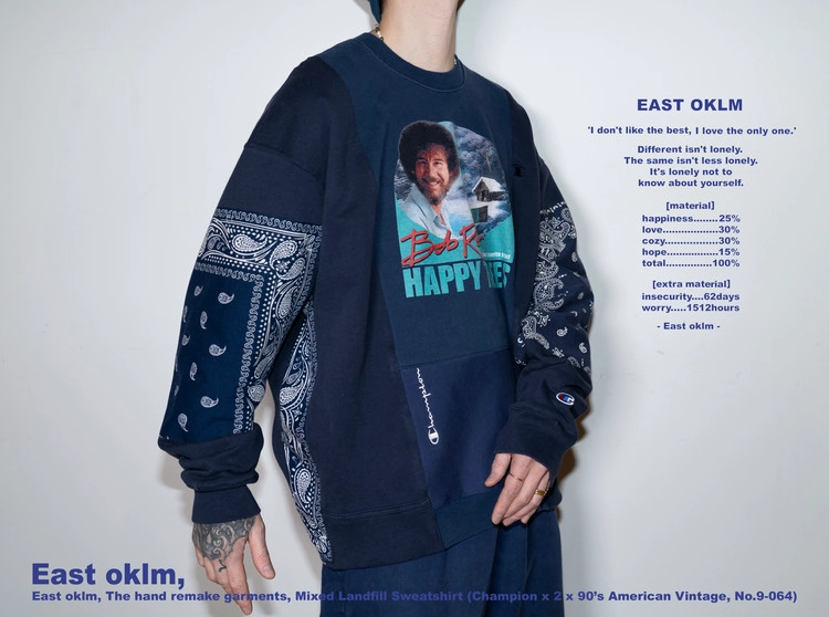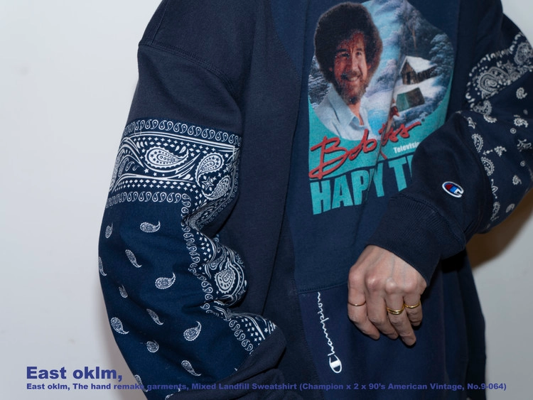 East oklm, The hand remake garments로 빈티지 Champion 스웻셔츠들과 90’s American Vintage 스웻셔츠를 해체하고 재구성하여 반다나로 포인트를 더한 리메이크 스웻셔츠 제품.