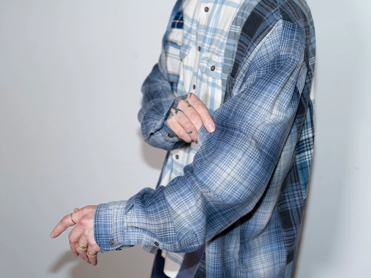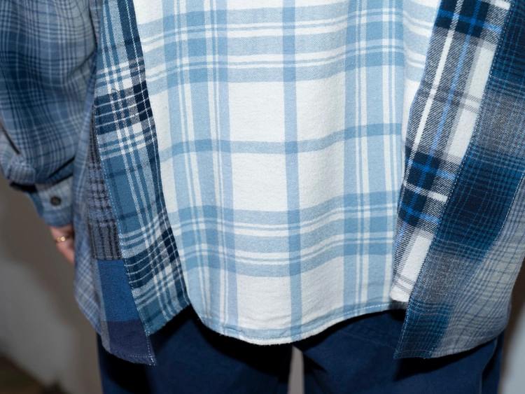 East oklm, The hand remake garments로 여러장의 플란넬 셔츠들을 해체하고 재구성하여 완성된 믹스 셔츠 상품.