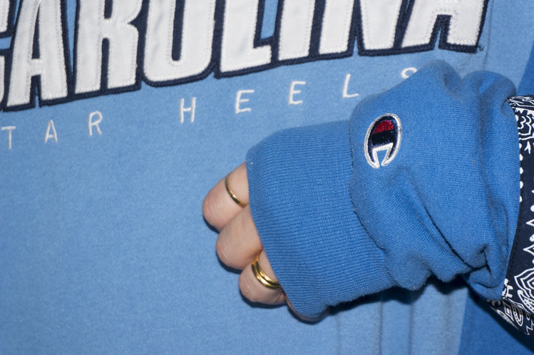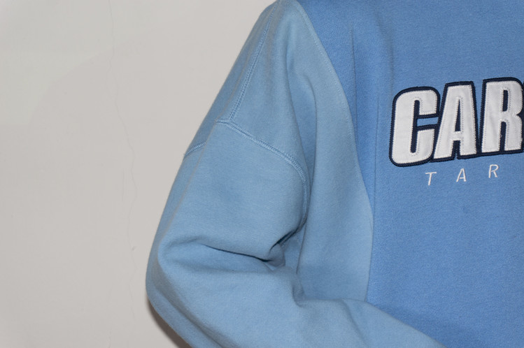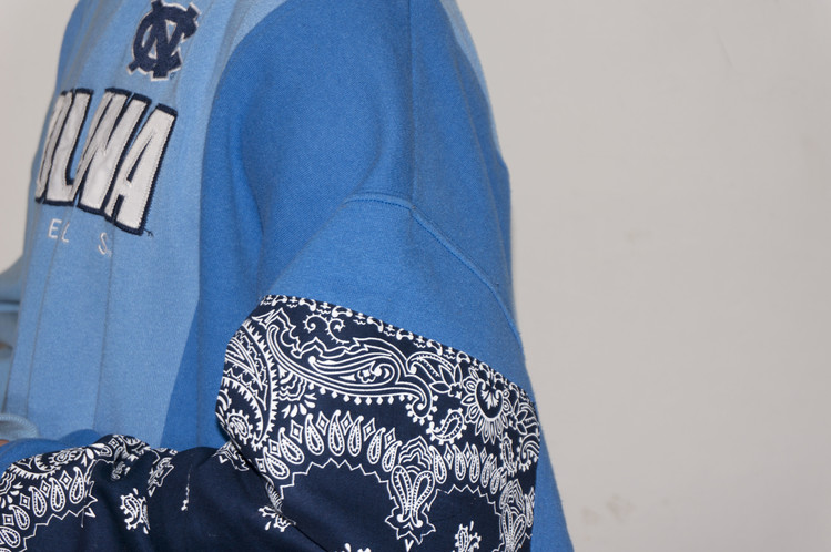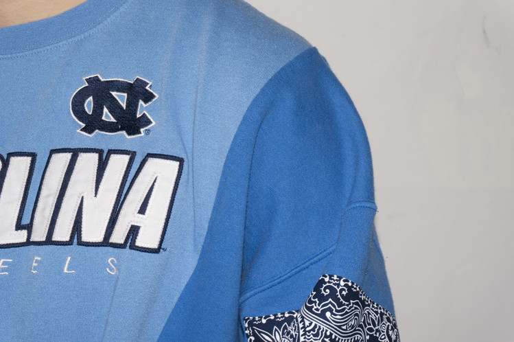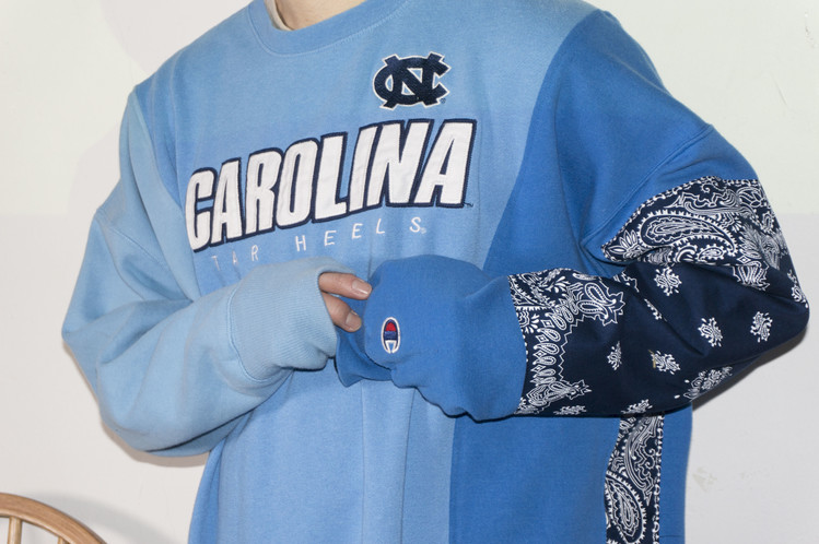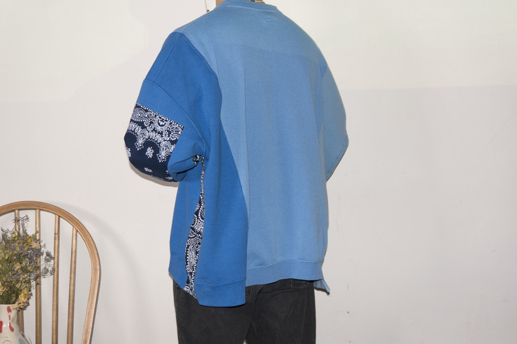 왼쪽의 블루 색상의 소매에 네이비 색의 반다나를 균형적으로 패치워크하고 옆을 채워 넣어 양옆의 균형을 잡았으며, 챔피온 스웻셔츠의 자수를 볼 수 있습니다.