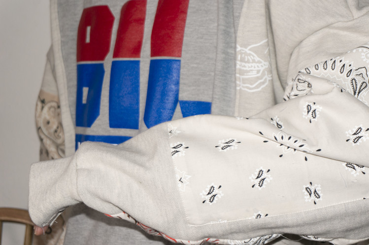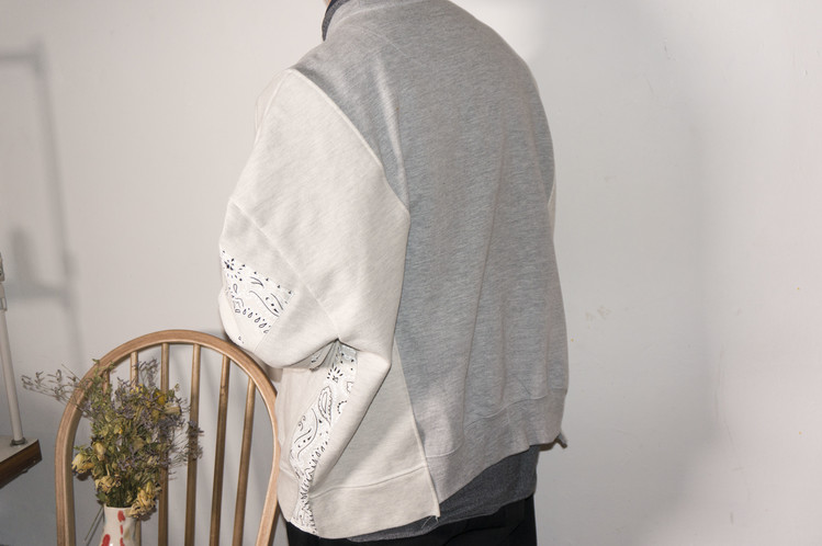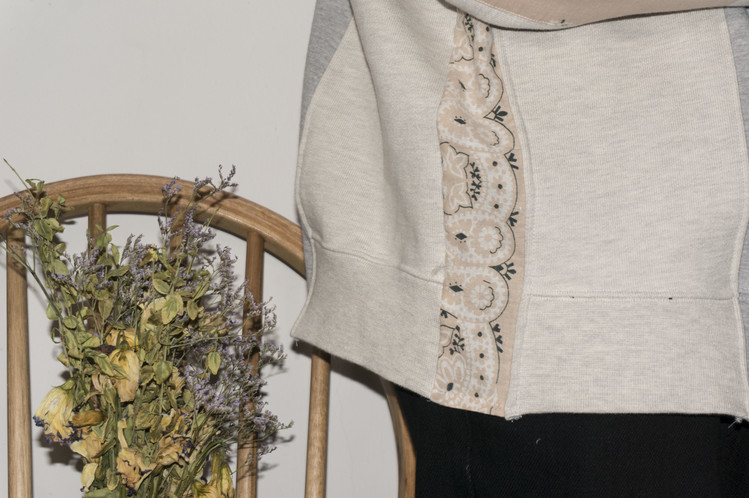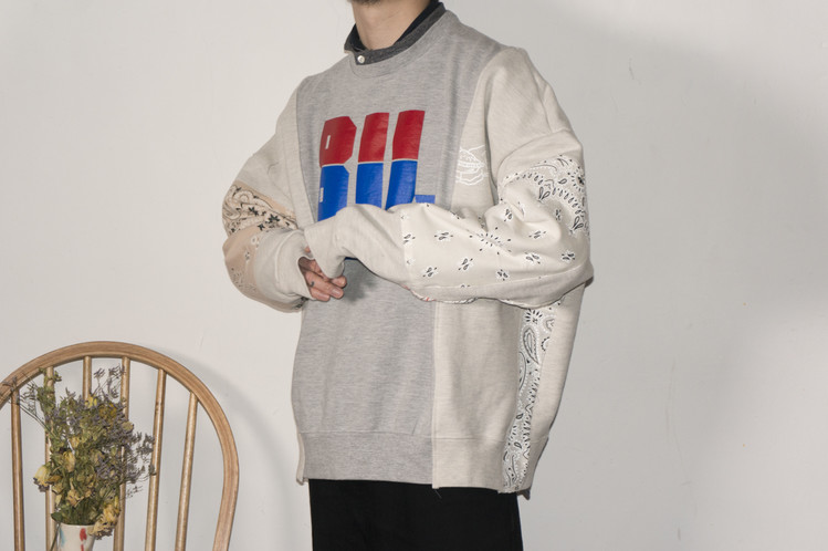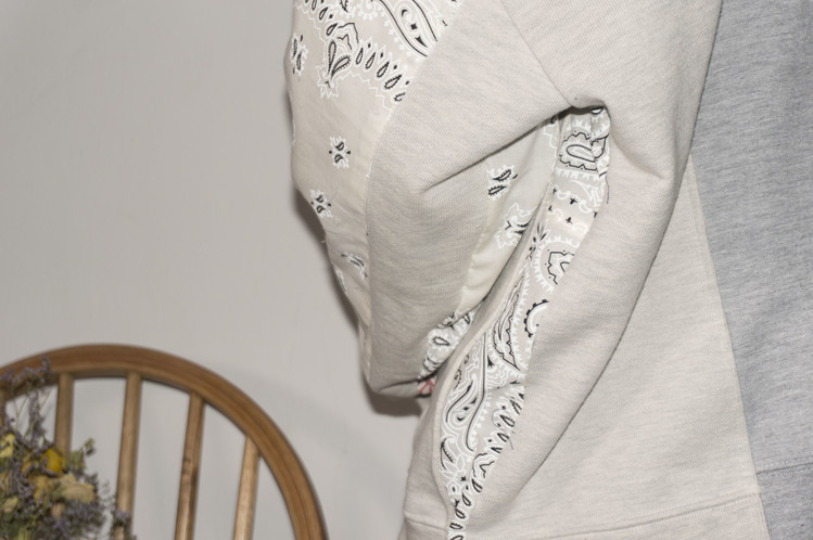 East oklm, The hand remake garments로 스웻셔츠를 믹스하고 양쪽 소매와 옆을 반다나로 표현한 상품. 밝은 그레이 색상과 아이보리 색상의 믹스로 전체적으로 차분한 분위기를 가지고 있어 반다나 또한 같은 분위기의 컬러감으로 표현하였습니다.