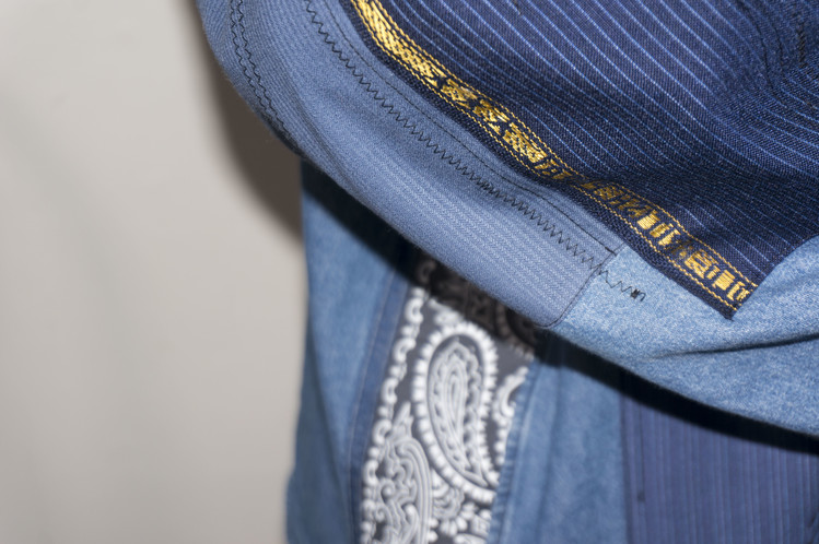 양쪽 소매의 부분은 테일러 원단의 혼용률과 출처가 나와있는 리미지 부분을 포인트로 하여 옐로우와 흰색으로 자리하며, 자칫 생길 수 있는 패치워크의 지루함을 지워주고 있습니다.
