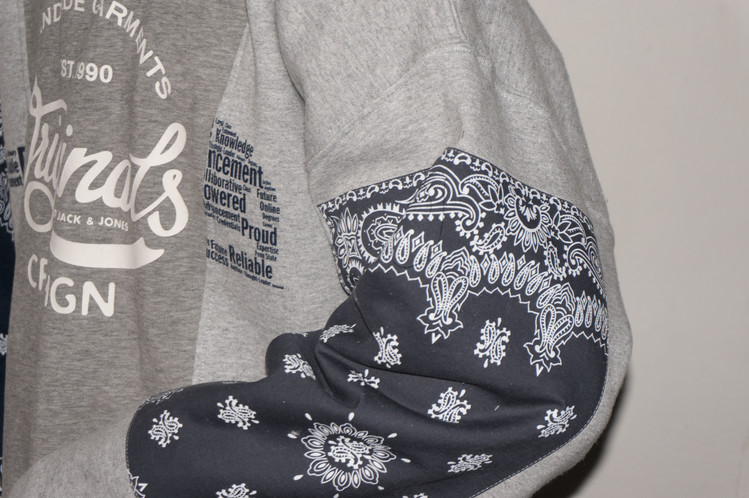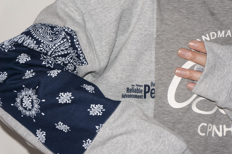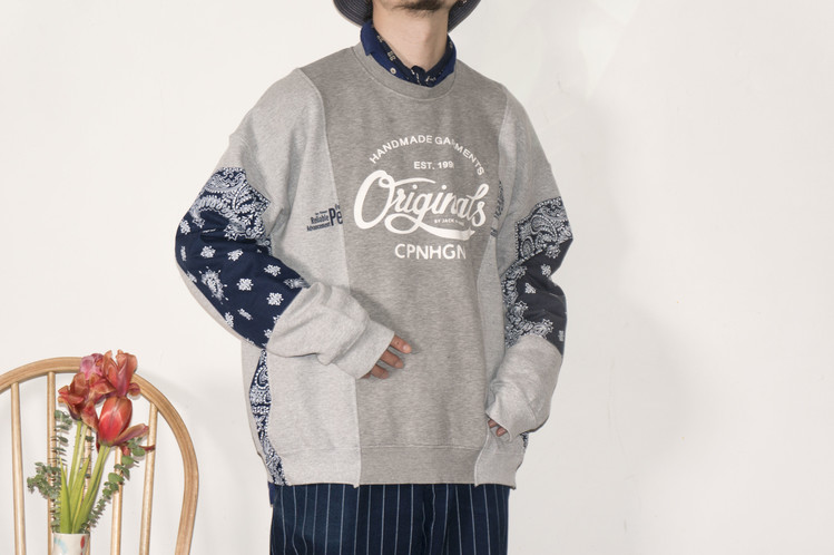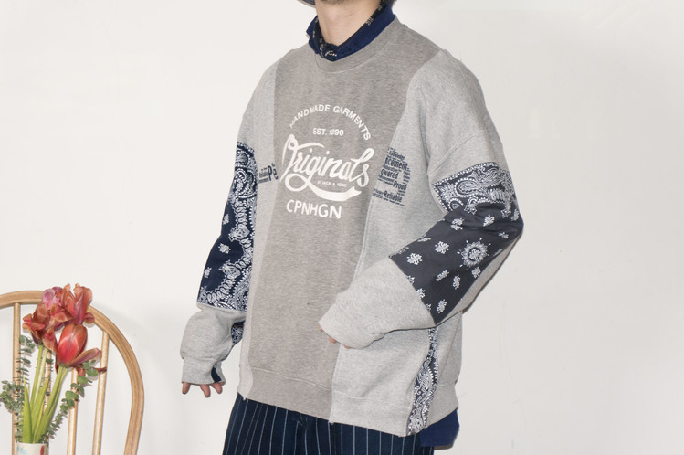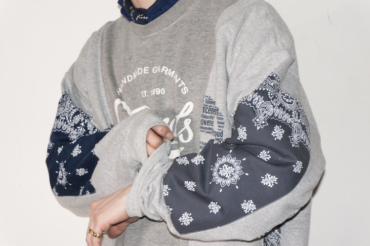 East oklm, The hand remake garments로 그레이 색상의 스웻셔츠들을 믹스하고, 반다나를 이용하여 표현된 상품. 그레이 색상의 스웻셔츠들을 연결하여 보다 느긋한 실루엣으로 표현된 옷으로, 양쪽 소매에는 넓게 패치워크 된 반다나를 볼 수 있습니다.