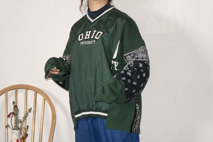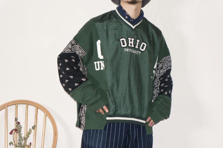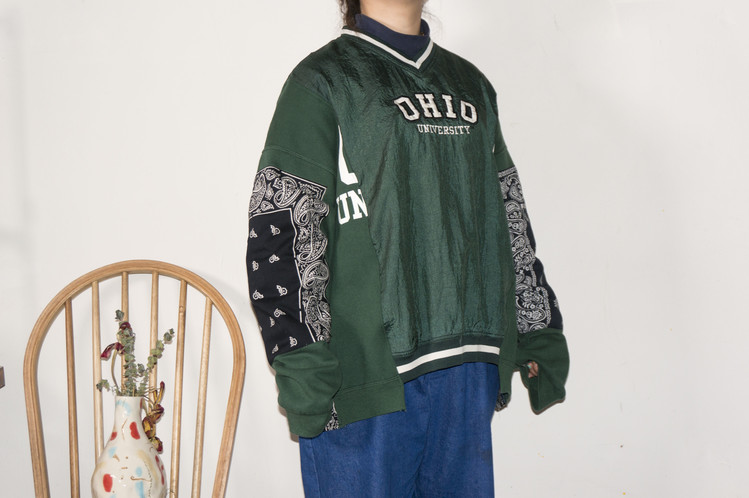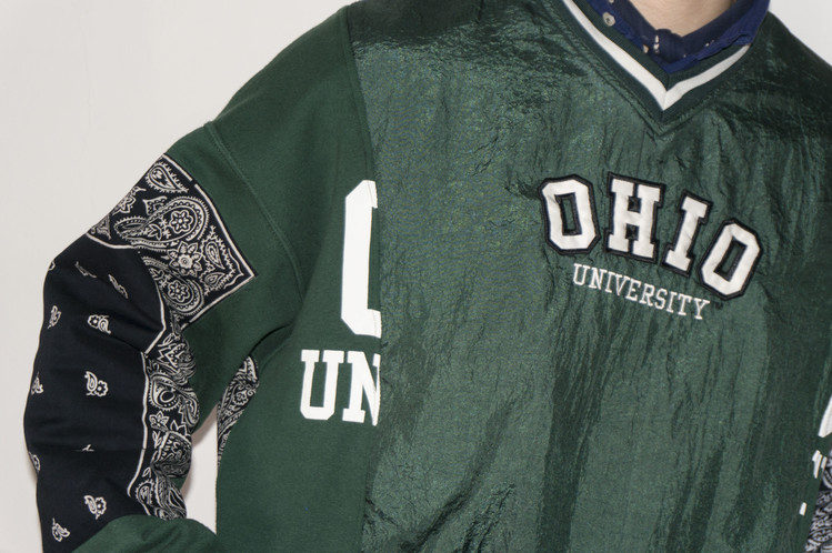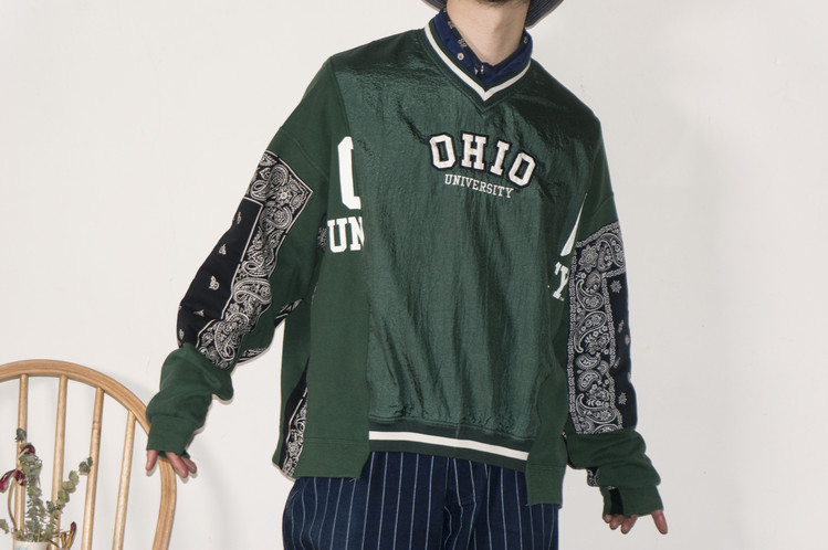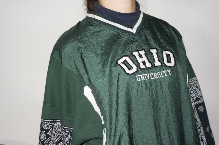 Ohio university 문구가 새겨진 윈드 브레이커와 스웻셔츠를 이용하여 앞판을 표현하였으며, 스웻셔츠는 스펠링의 맨앞과 뒤만 보이게 연결되었습니다.