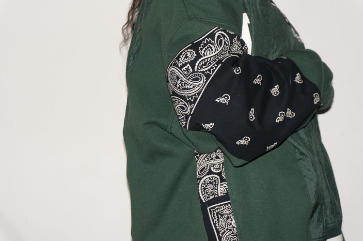 양쪽 소매에 패치워크 되어진 블랙 반다나는 서로의 문양이 달라 좋은 포인트로 자리하며, 옆을 채워 넣어 보다 여유로운 소매의 실루엣을 느낄 수 있습니다. 다른 재질의 원단을 연결하여 만들어져 보다 특별한 느낌으로 표현된 하나의 옷 입니다.