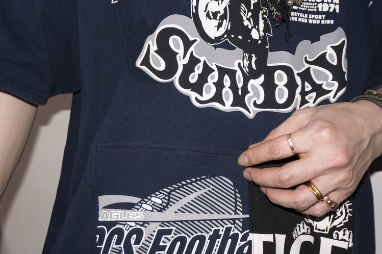 East oklm, The hand remake garments로 ‘On Any Sunday’의 프린팅이 있는 네이비 색상의 티셔츠를 중심으로 여러장의 티셔츠를 재구성하여 만들어진 상품.