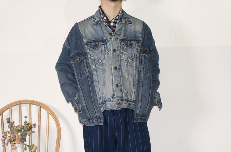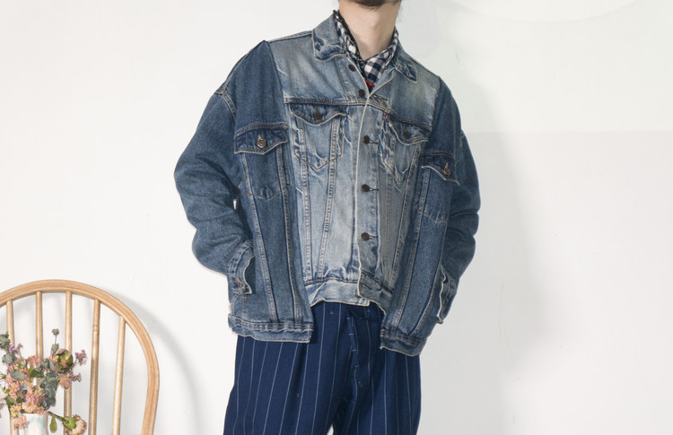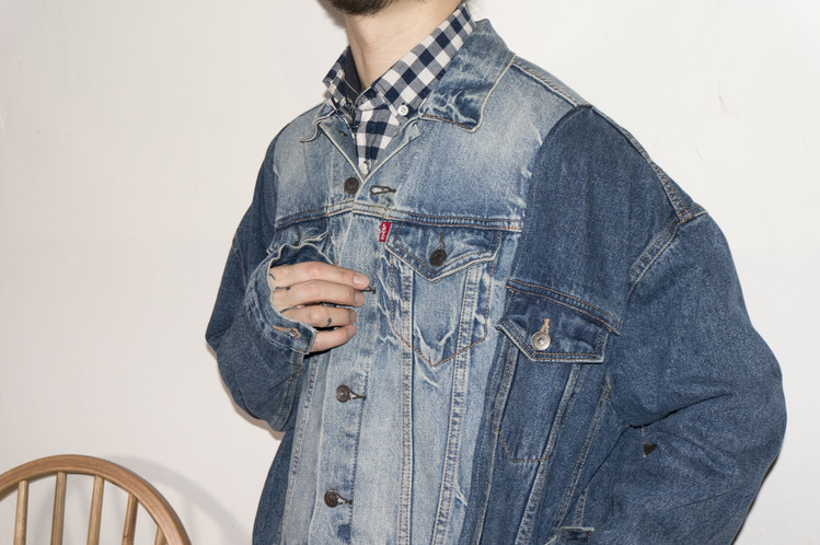 East oklm, The hand remake denim으로 연한 색상의 리바이스 데님 자켓과 진한 색상의 데님 자켓을 연결하여 만들어진 상품. 서로 다른 색감과 다른 길이감의 표현으로 재구성 되었고, 앞판에 연결되어진 4개의 포켓을 볼 수 있습니다.