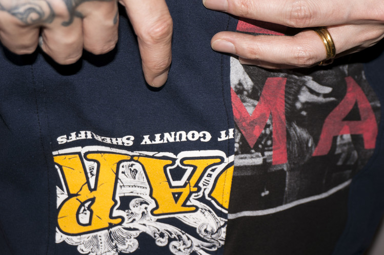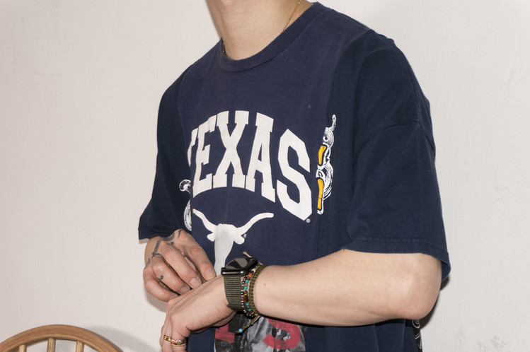 조각난 프린팅은 불규칙적으로 뒤집어 표현된 부분도 볼 수 있습니다. 티셔츠 마다의 색감차이 또한 재구성된 파트의 포인트로 즐길 수 있고, 뒷판의 반다나 포인트 또한 좋은 구성으로 자리합니다.