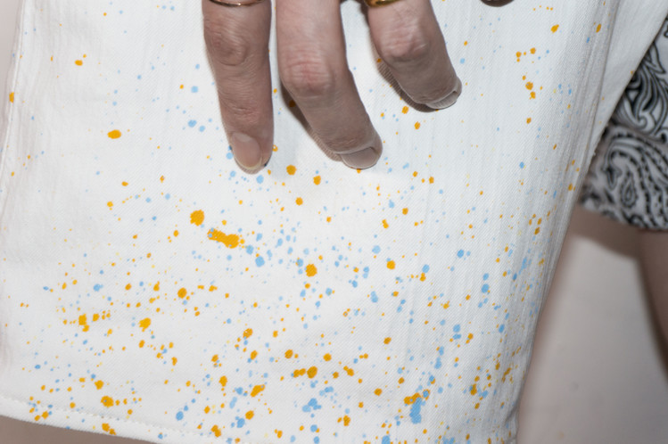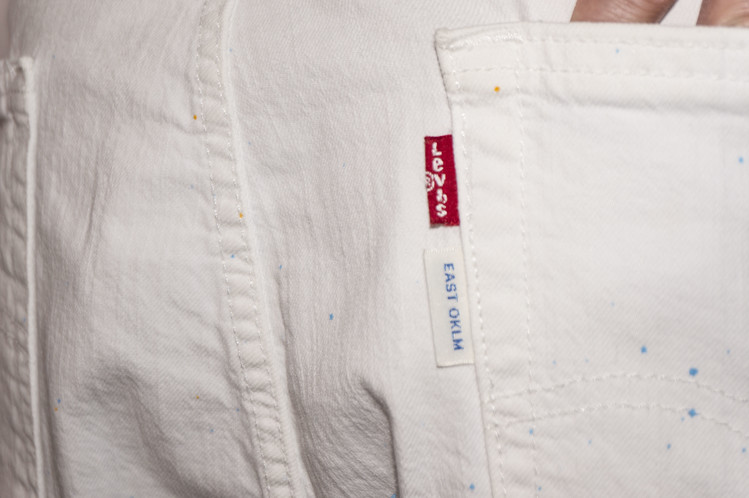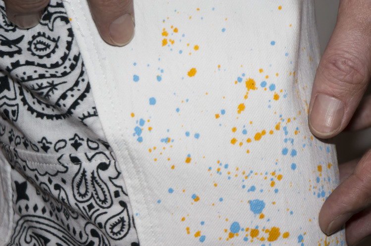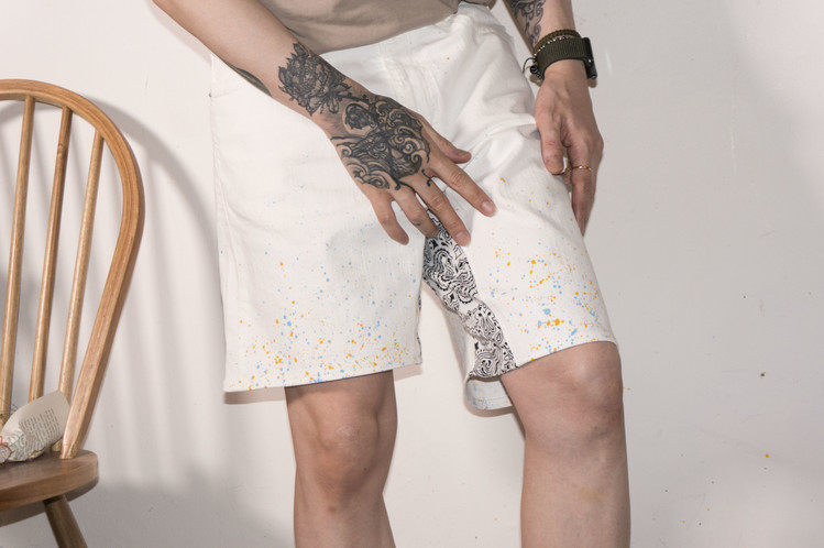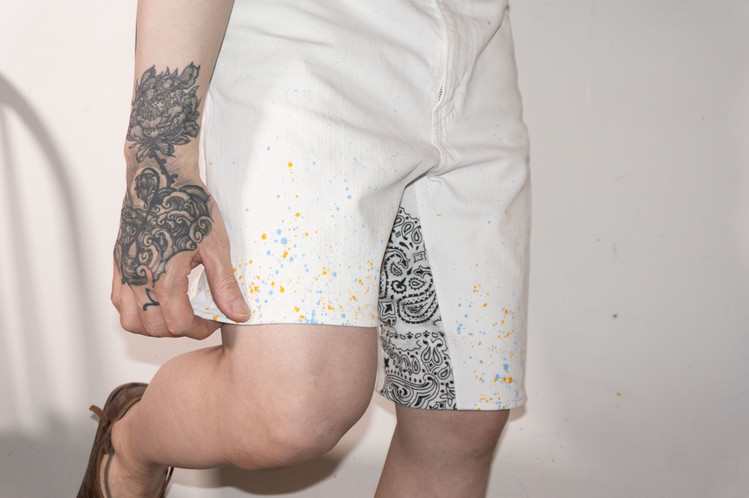 East oklm, The hand remake denim으로 Levis 513 화이트 진을 이용하여 언밸랜스한 길이감의 Shorts로 재해석하고, 옐로우 색상과 스카이 블루 색상의 뿌려진 페인팅과 안심을 반다나로 채워 만든 상품. 화이트 반다나를 이용하여 넓게 채워진 부분은 2겹의 반다나로 비침현상을 방지하였고, 아래쪽 위주로 뿌려진 페인팅으로 좋은 포인트를 만들었으며, 조화로운 색감의 균형을 확인할 수 있는 옷으로 완성 되었습니다.