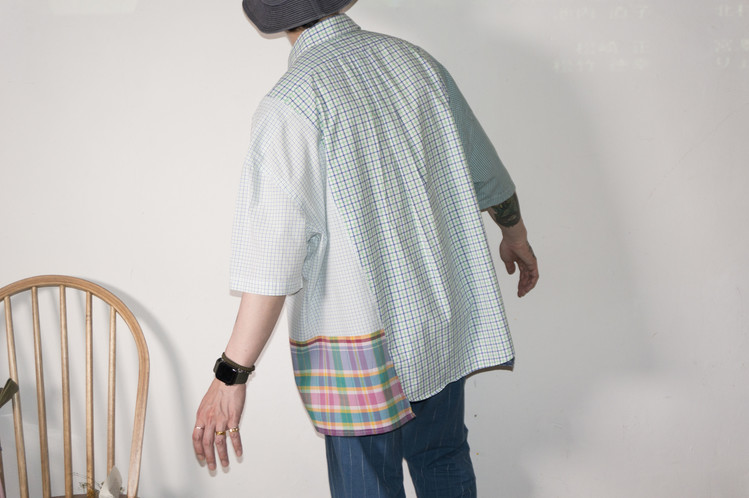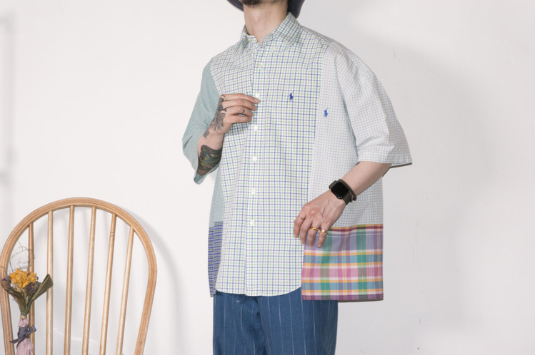 East oklm, The hand remake garments로 여러장의 Polo Ralph Lauren 셔츠들을 해체하고 재구성하여 만들어진 상품. 전체적으로 그린색상의 톤을 가지고 있는 셔츠들로 구성되어져 있어 보다 안정감있는 색감의 조화와 균형을 볼 수 있고, 귀여운 느낌으로 완성되어진 셔츠 입니다.