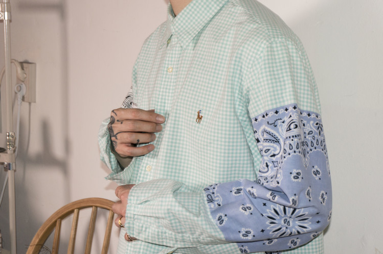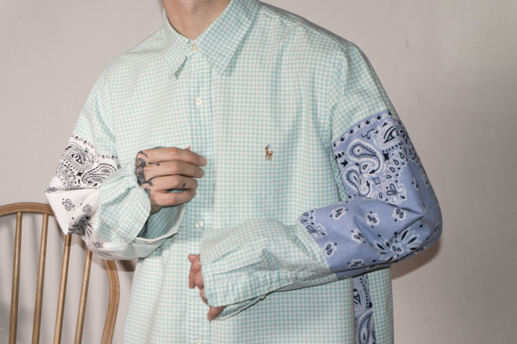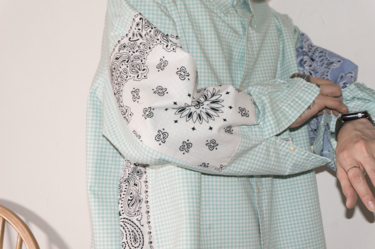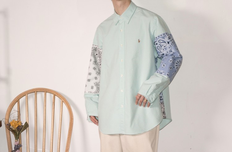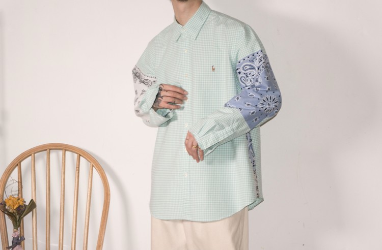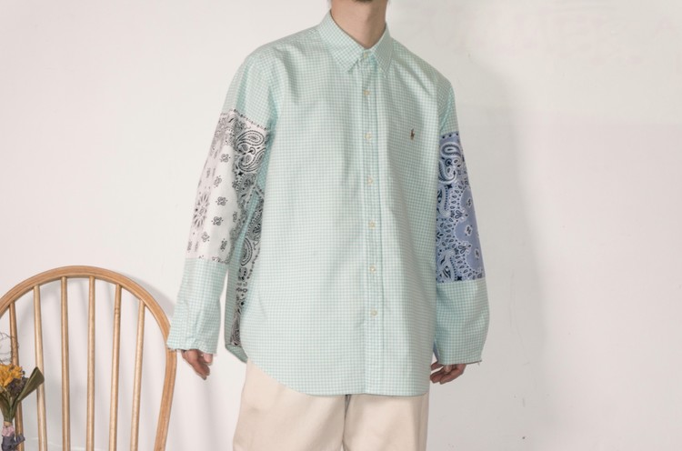 East oklm, The hand remake garments로 민트 색상 체크 패턴의 폴로 셔츠에 반다나로 양쪽 소매에 넓게 패치워크 하고 옆을 채워 만들어진 상품. 민트 색상과 조화롭게 어울리는 화이트, 스카이 블루 색상의 반다나를 이용하여 균형있는 색감을 볼 수 있으며, 옆을 채우고 있는 반다나는 여유로운 실루엣을 만들어 주고, 동시에 움직임과 함께 보여질 좋은 포인트로 자리 합니다.