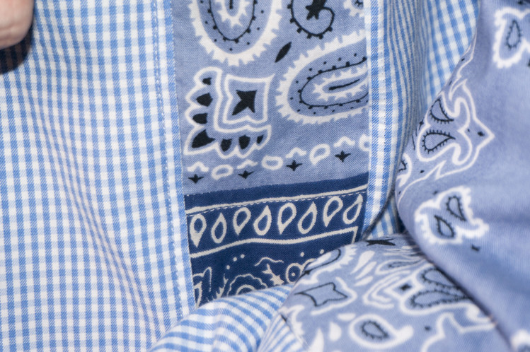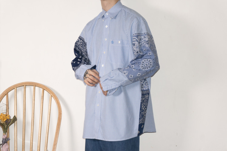 East oklm, The hand remake garments로 시원한 Sky blue 체크패턴의 Wrangler 셔츠에 반다나로 양쪽 소매에 넓게 패치워크 하고 옆을 채워 만들어진 상품. 스카이 블루 색상과 같은 톤의 반다나와 네이비 색상의 반다나를 이용하여 시원한 균형감을 볼 수 있으며, 옆을 채우고 있는 반다나로 보다 여유로운 실루엣을 즐길 수 있음과 동시에 움직임과 함께 보여지는 포인트 입니다.