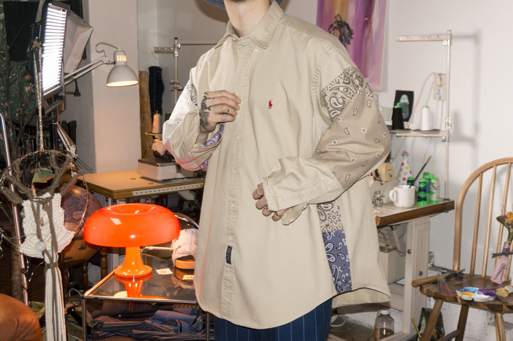 East oklm, The hand remake garments로 베이지 색상의 Polo Ralph Lauren 셔츠의 양쪽 소매에 넓게 반다나 패치워크를 진행하고, 옆을 채워 만들어진 Landfill shirt 상품. 같은 베이지 색상의 반다나를 이용하여 표현되었으나, 서로 다른 톤을 가져 매력적으로 보일 수 있도록 배치하였고, 옆을 채운 반다나는 어두운 그레이 색상과 연보라 색상의 포인트들을 즐길 수 있게 하였습니다.