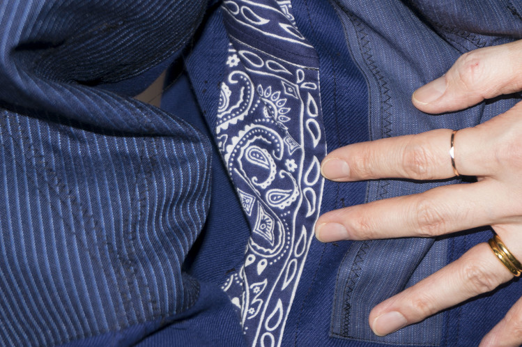 왼쪽 소매에는 테일러 원단의 리미지 부분을 활용한 좋은 포인트가 있으며, 옆을 채운 네이비 색상의 반다나는 여유로운 실루엣을 가지는 역할이자, 움직임과 함께 보여질 부분으로 자리 합니다.