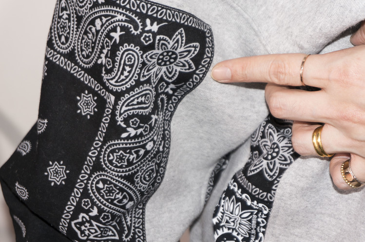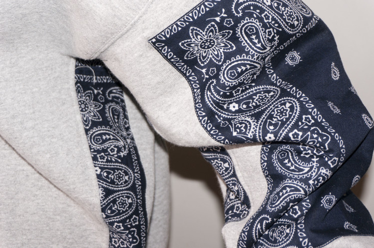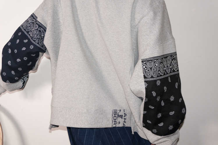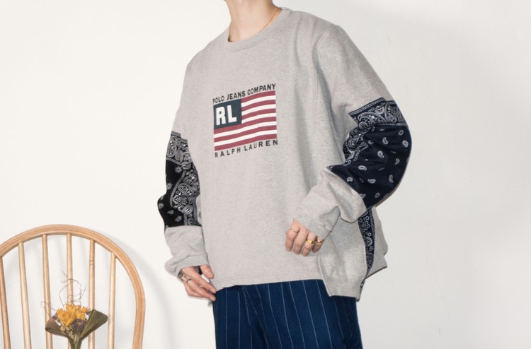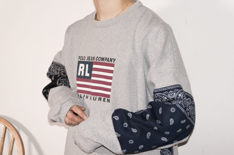 East oklm, The hand remake garments로 Polo jeans co. 스웻셔츠와 같은 톤의 그레이 색상 스웻셔츠를 믹스하고, 반다나를 이용하여 포인트를 만든 상품. 전체적으로 여유롭고 느긋한 실루엣으로 만들어지고, 양쪽 소매와 옆을 채운 반다나는 네이비 색상과 블랙 색상으로 각각 다른 컬러를 이용하여 차이를 볼 수 있도록 하였습니다.