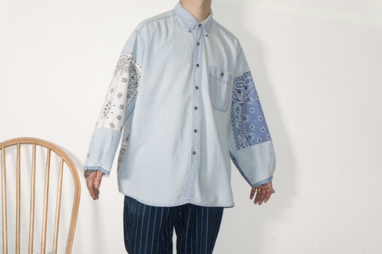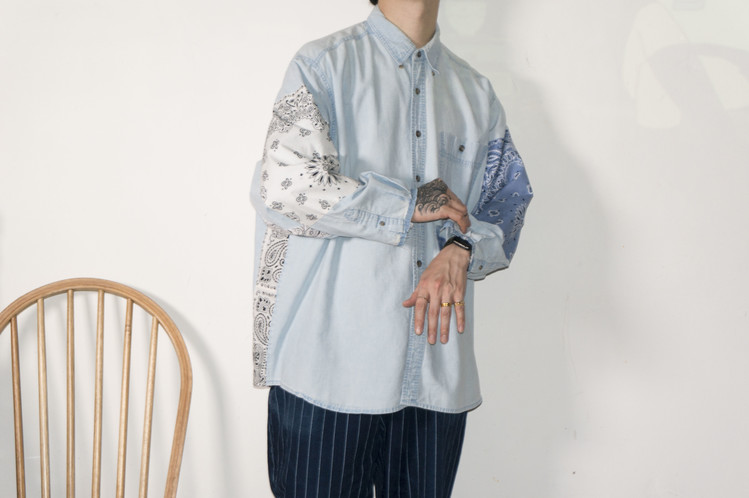 East oklm, The hand remake denim으로 연청의 Wrangler 데님 셔츠에 반다나를 이용하여 만든 Landfill 셔츠 상품. 화사하고 깨끗한 느낌의 연청의 분위기와 같이 스카이 블루와 화이트 색상의 반다나로 양쪽 소매에 넓게 패치워크하고, 옆을 채워 조화로운 색의 균형을 볼 수 있습니다.